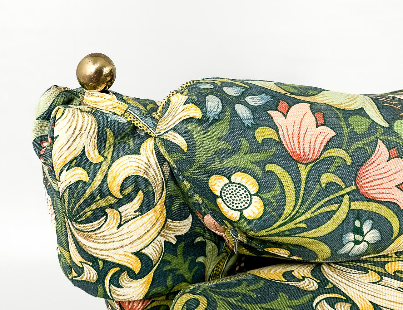 Asiento y respaldo holgados, orejas de felpa, pomos de latón. Altura aprox. 65 cm, longitud aprox. 200 cm, altura del asiento aprox. 46 cm.