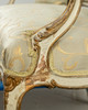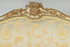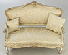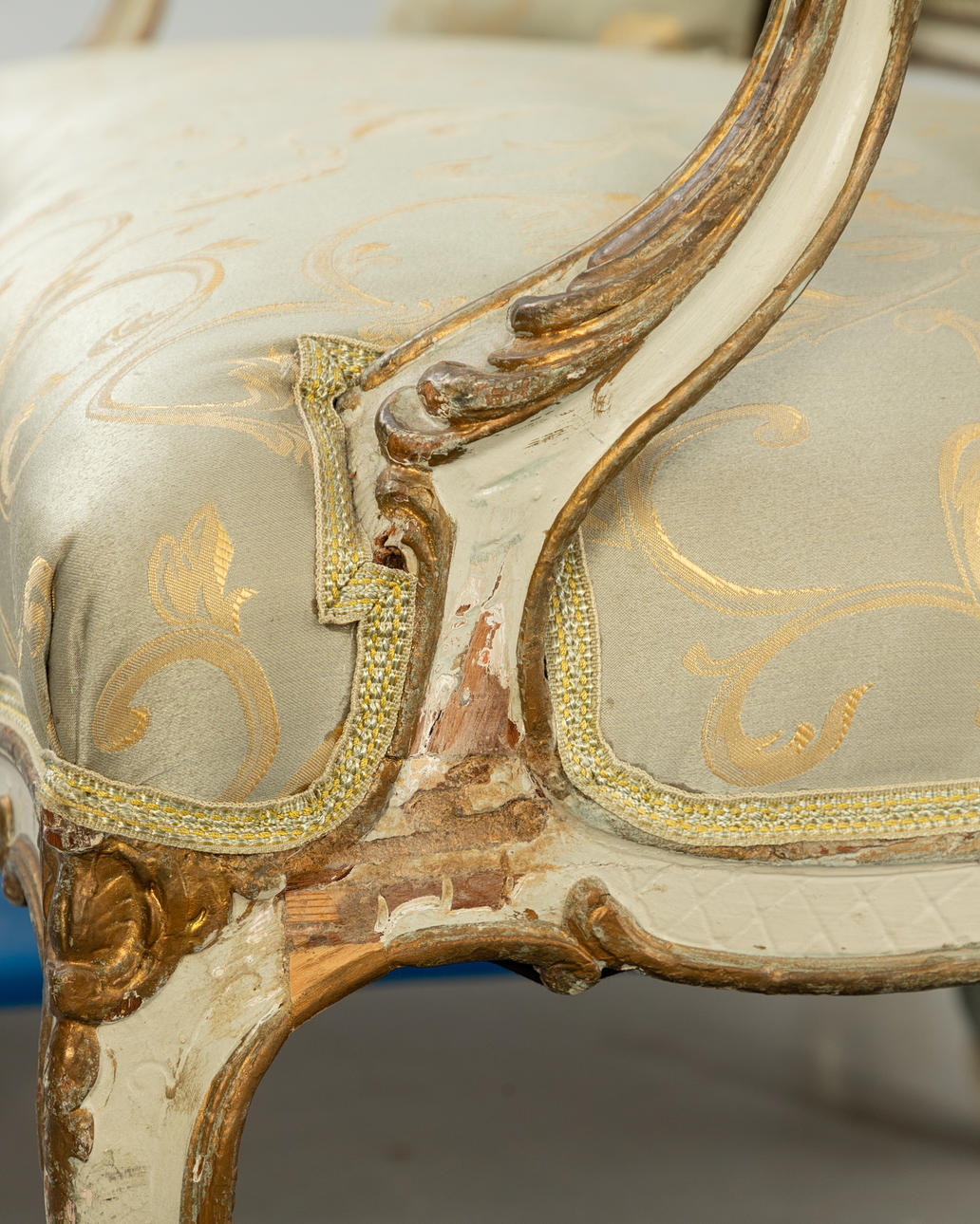 Madera con varios patrones de corte, pintada en blanco y dorado. Cuerpo curvo con marco trapezoidal. En las rodillas, las patas curvas y la parte delantera de los laterales, adornos de plantas y conchas. Canto. Funda textil de damasco Apoyabrazos abiertos