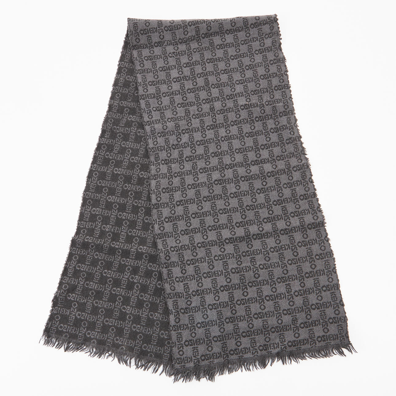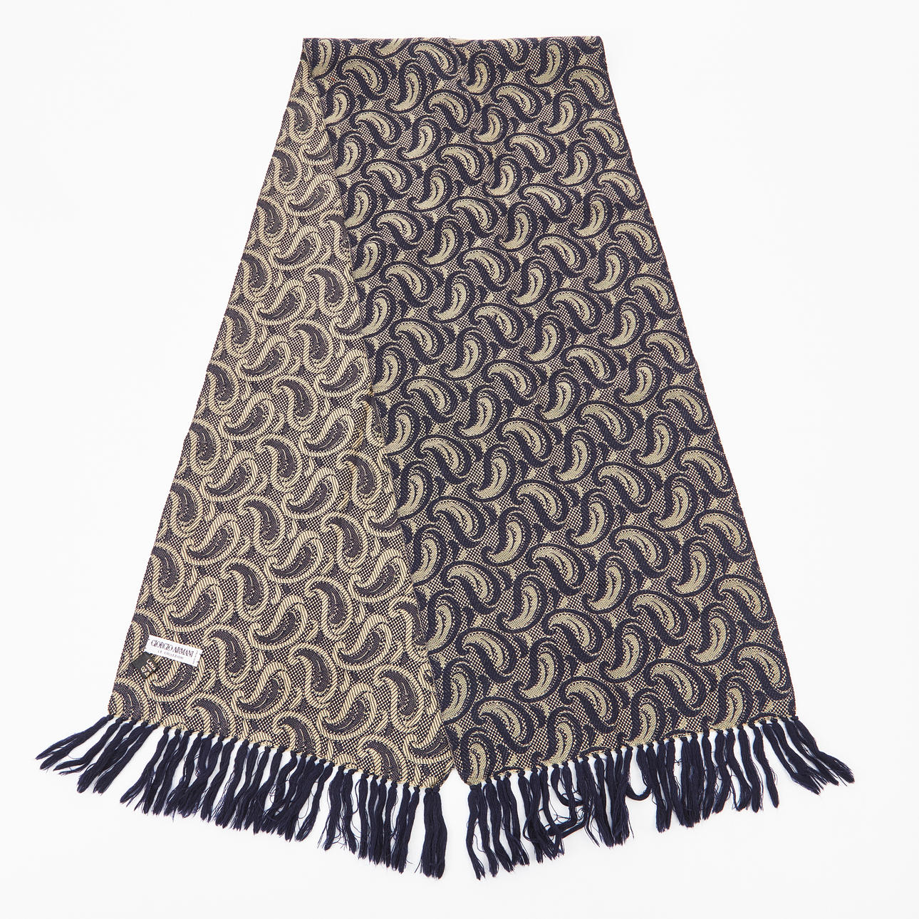 De lana, chal estampado en azul y beige con flecos azules, etiqueta con la inscripción «Georgio Armani le Collezioni», bufanda con flecos, estampado tejido con «Kenzo», dimensiones aproximadas de 168x32 y 148x32 cm.
