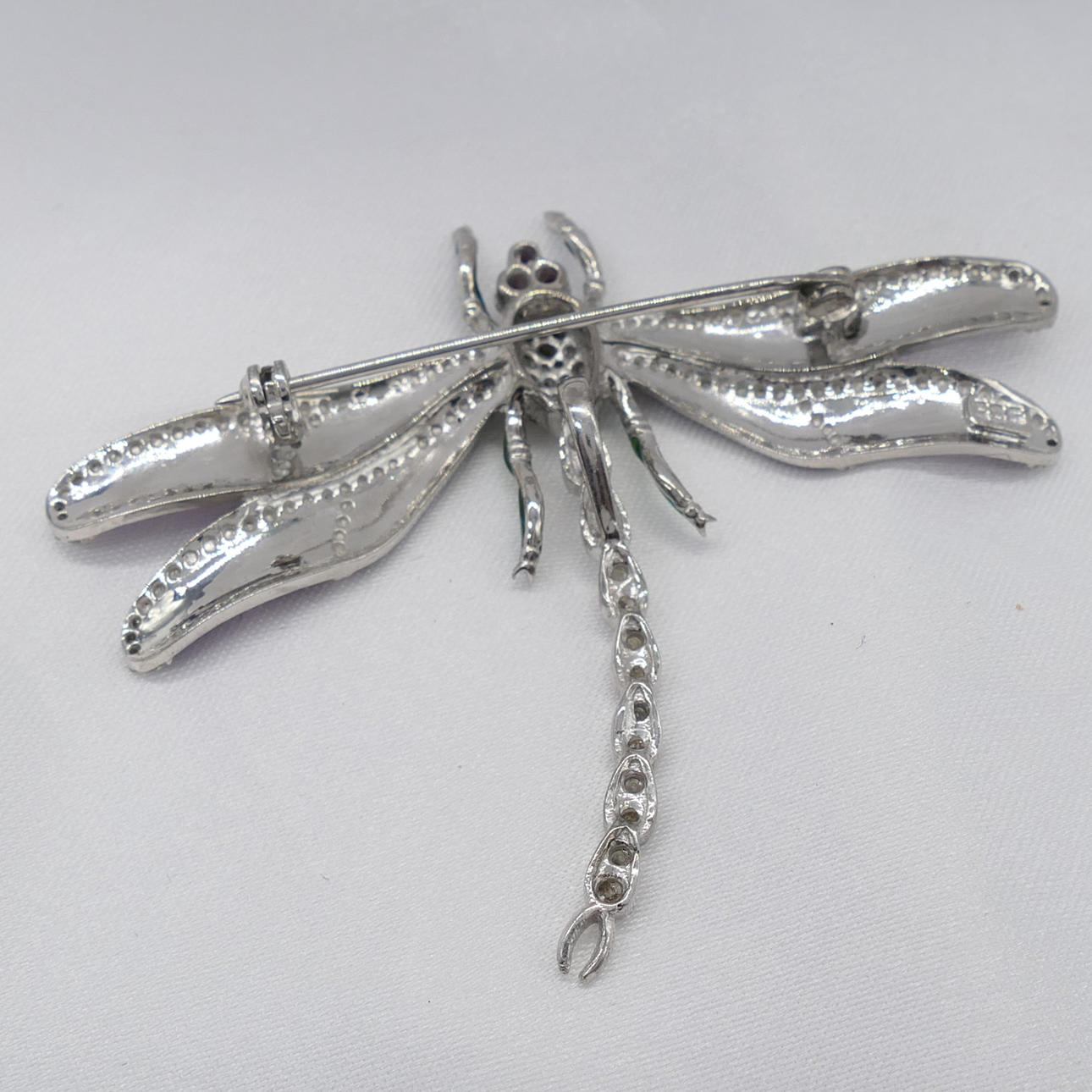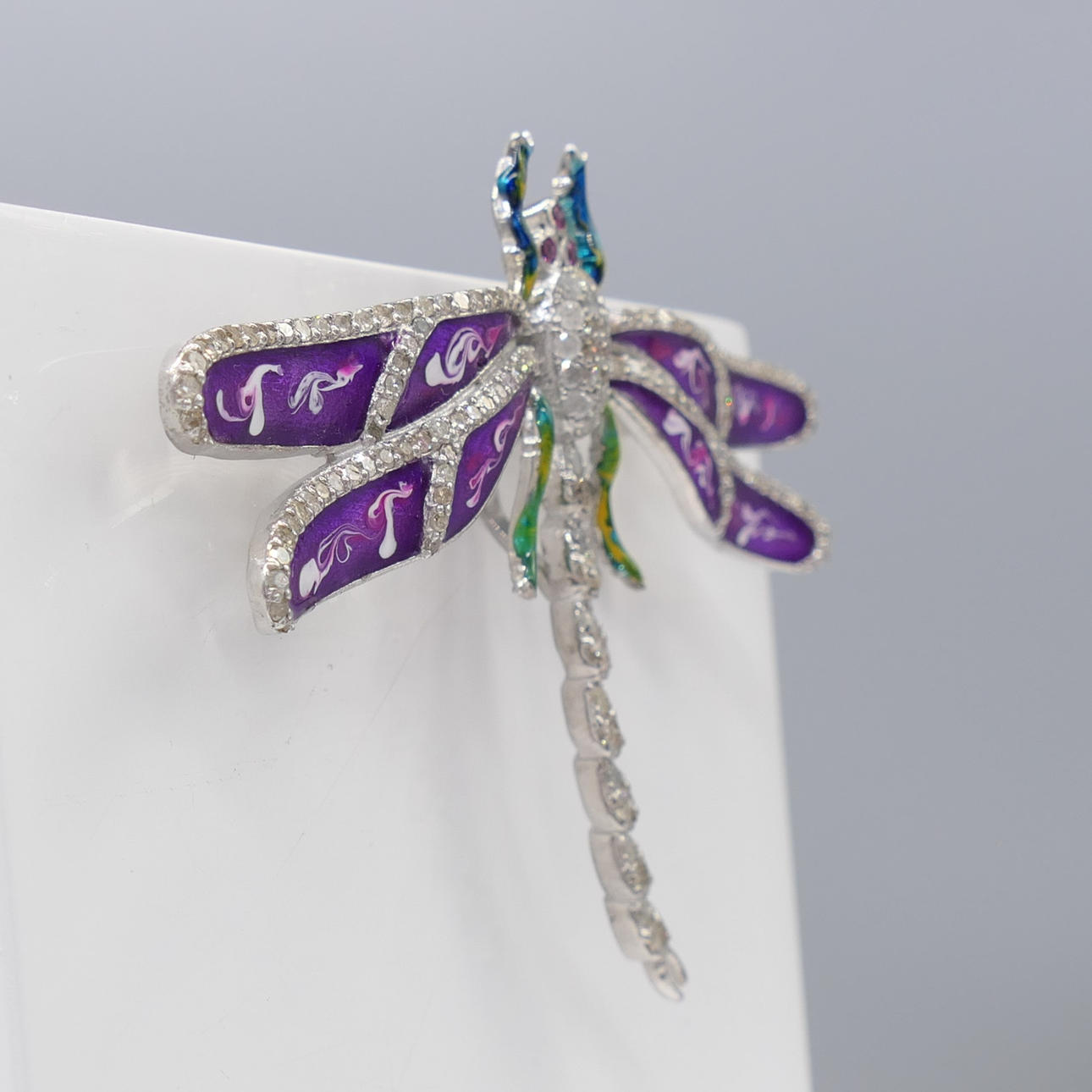 Un gran y emocionante broche y colgante todo en uno con forma de libélula plateada engastado con diamantes y piedras preciosas e incrustaciones de esmalte de colores