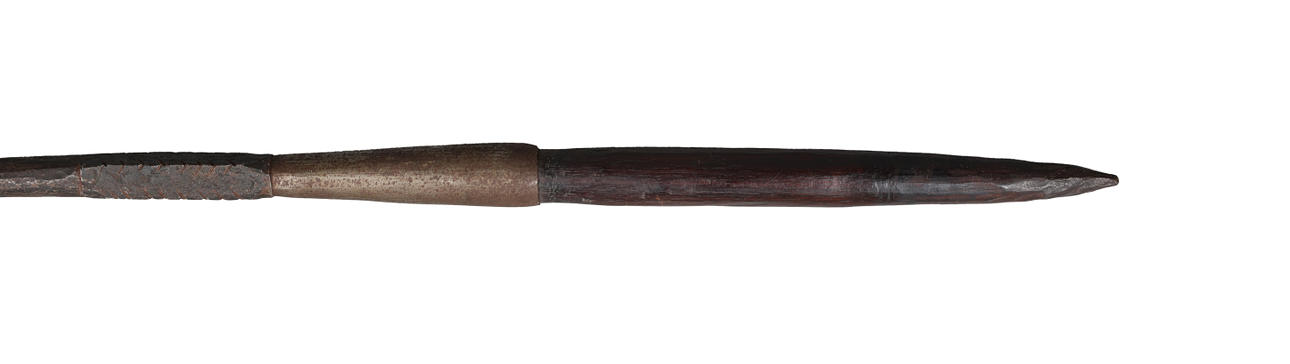 Lanza tribal africana de finales del siglo XIX y principios del XX, posiblemente masai, cabeza larga de hierro con punta cuadrada, eje de madera cortado y afilado en el extremo, punta de lanza de 71,5 cm, longitud total 94 cm.