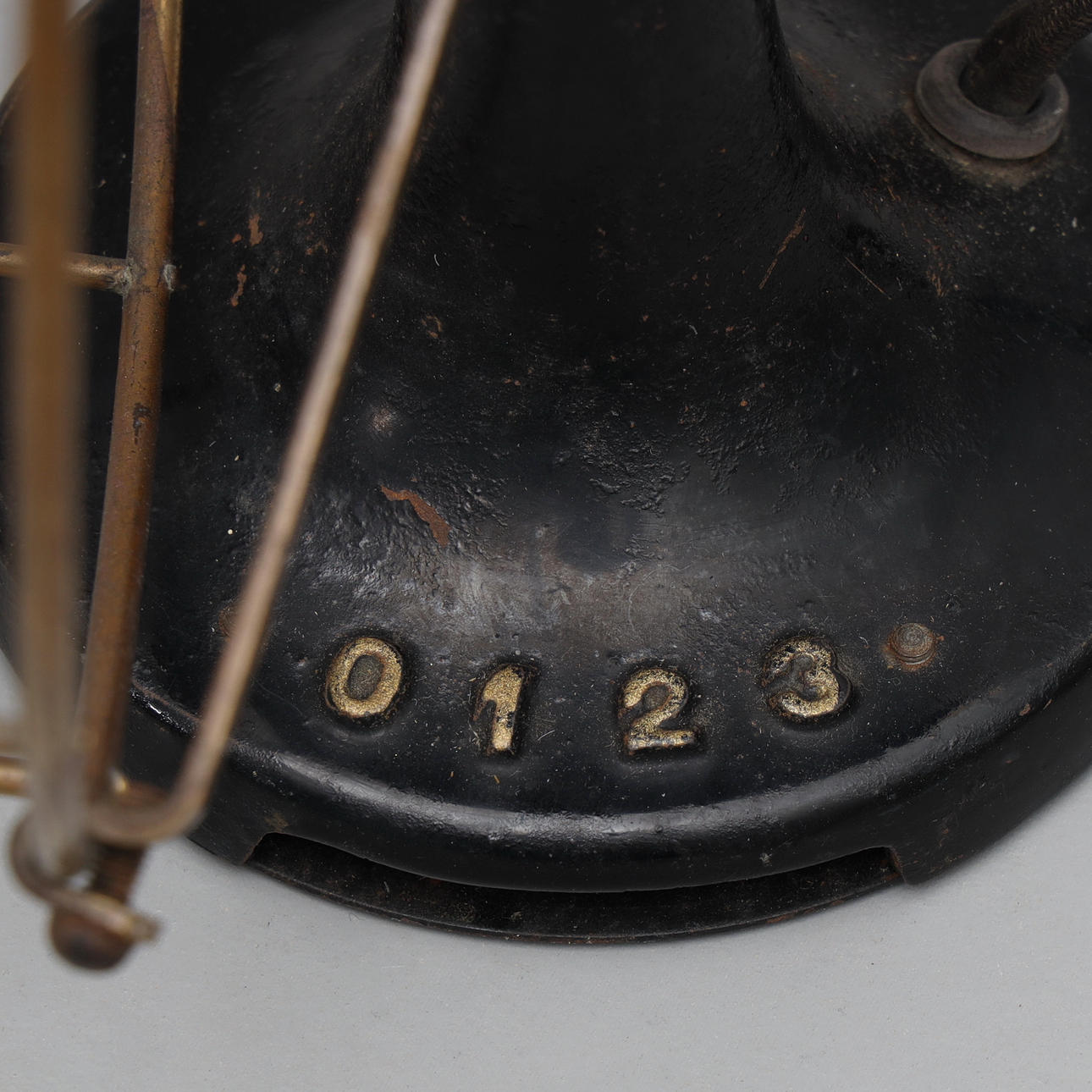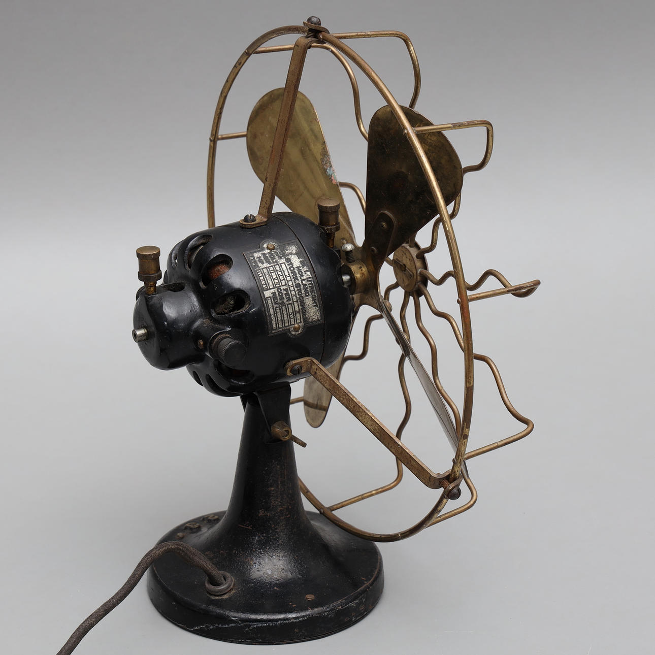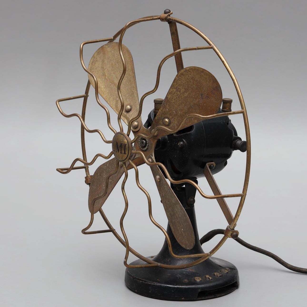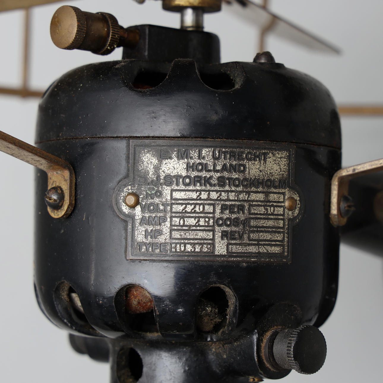 Ventilador de mesa de hierro, insignia con la inscripción E.M.I UTRECHT HOLLAND D.J. CIGÜEÑA. ESTOCOLMO.