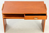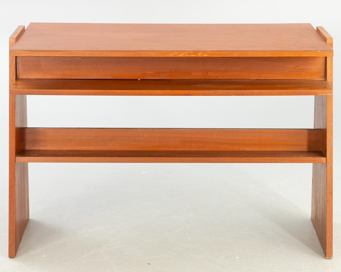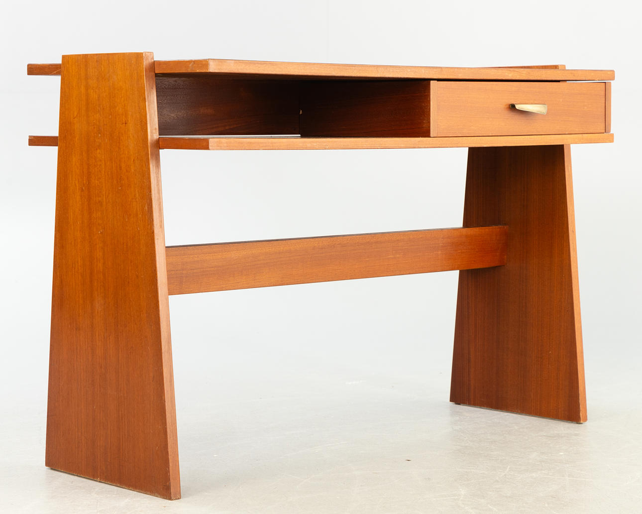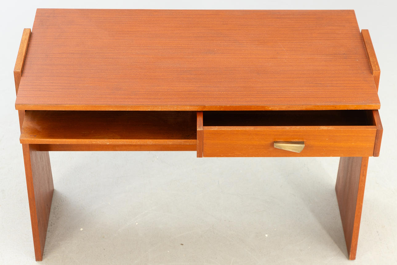 Teca parcialmente chapada. Superficie de escritura laminada con efecto madera Equipado con un cajón con asa de latón y un estante adicional debajo de la superficie de escritura.