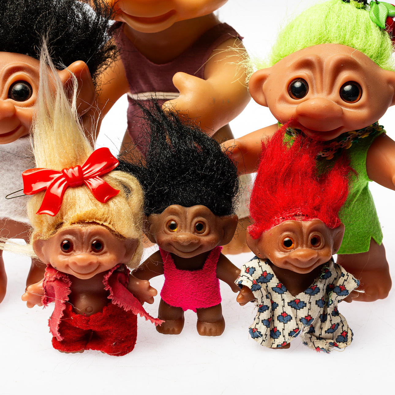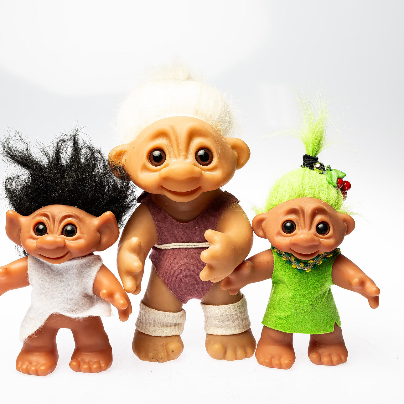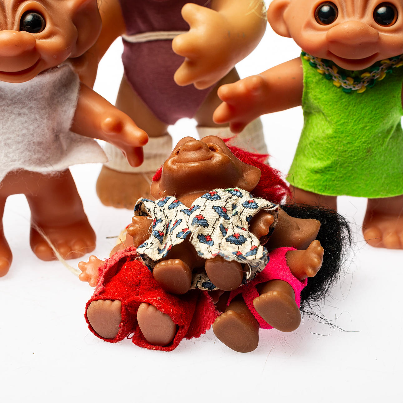 Desgastes normales de uso Troll pelirrojo con residuos de pegamento transparente alrededor del cabello.