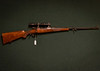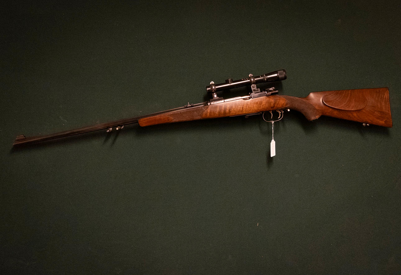 Repetidor alemán Bouncer. Fabrique el fusil deportivo Mauser Oberndorf modelo 98. Calibre 6.5x55. No adicional 110153. Caño semioctogonal de 60 cm de longitud con filo fresado y fácil de cortar. Visor plegable con tres mirillas. Revista saqueable con turno de apertura. Por favor, presiona con doble gatillo. Fusible de cuarzo montado. Pistón con empuñadura de pistola y reposacabezas. chaqueta original de Mauser con cuernos. Rosetón con empuñadura de pistola de acero. Binoculares montados en gancho de tipo antiguo.