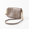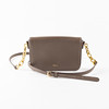 Bolso de piel beige, bandolera ajustable con cadena de metal amarillo. Tapa con cierre magnético. Forro interno con monograma, compartimento con cremallera y bolsillo abierto. Aprox. 21 x 4,5 x 14 cm. Caída unos 45-50 cm.