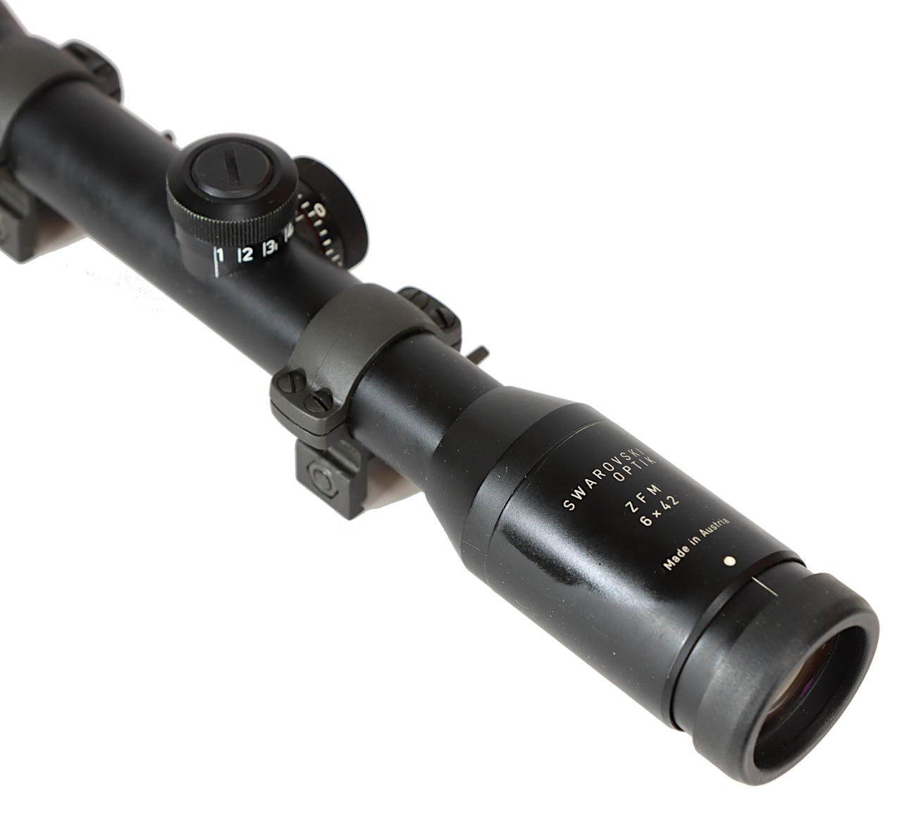 Tubo de 26 mm, alisador con escala de barras, anillos con cierre rápido. Tapa de lente. Número de serie A57460021.