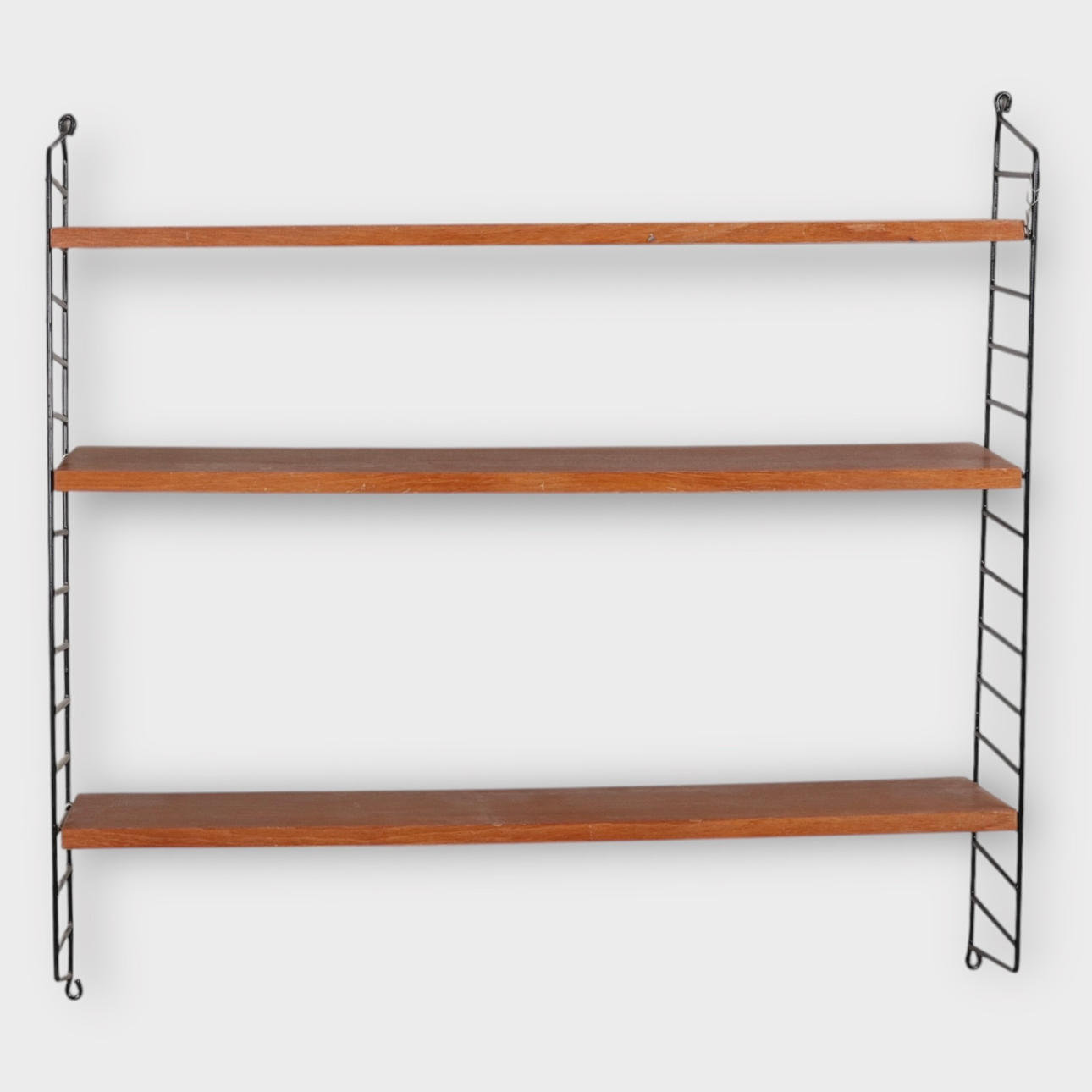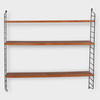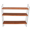 Estantería de pared, modelo string, 3 estantes en teca, frontones lacados en negro