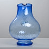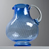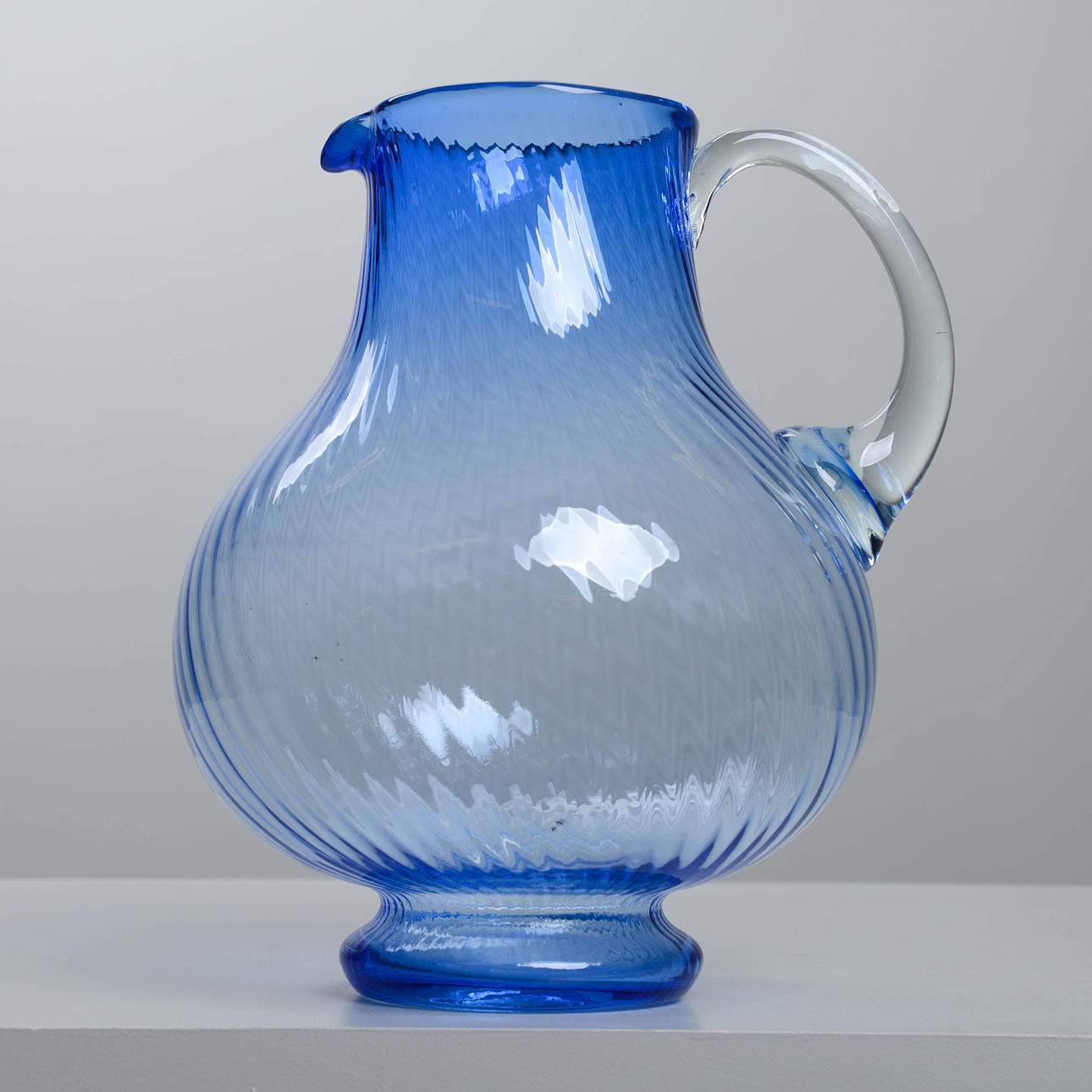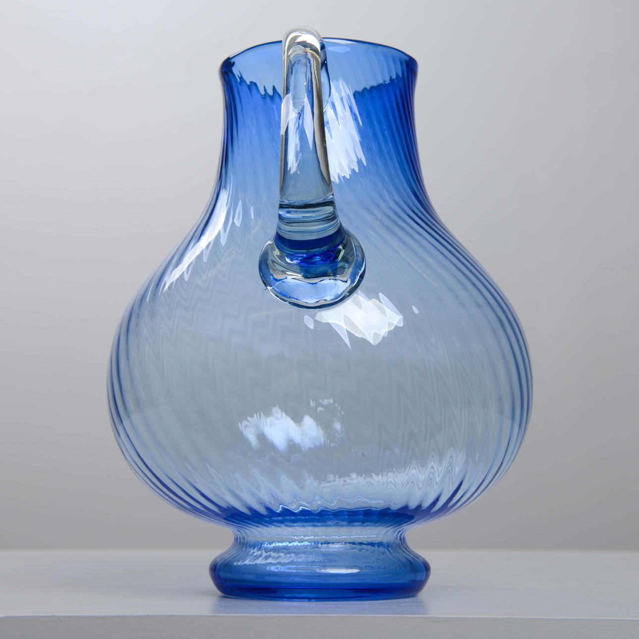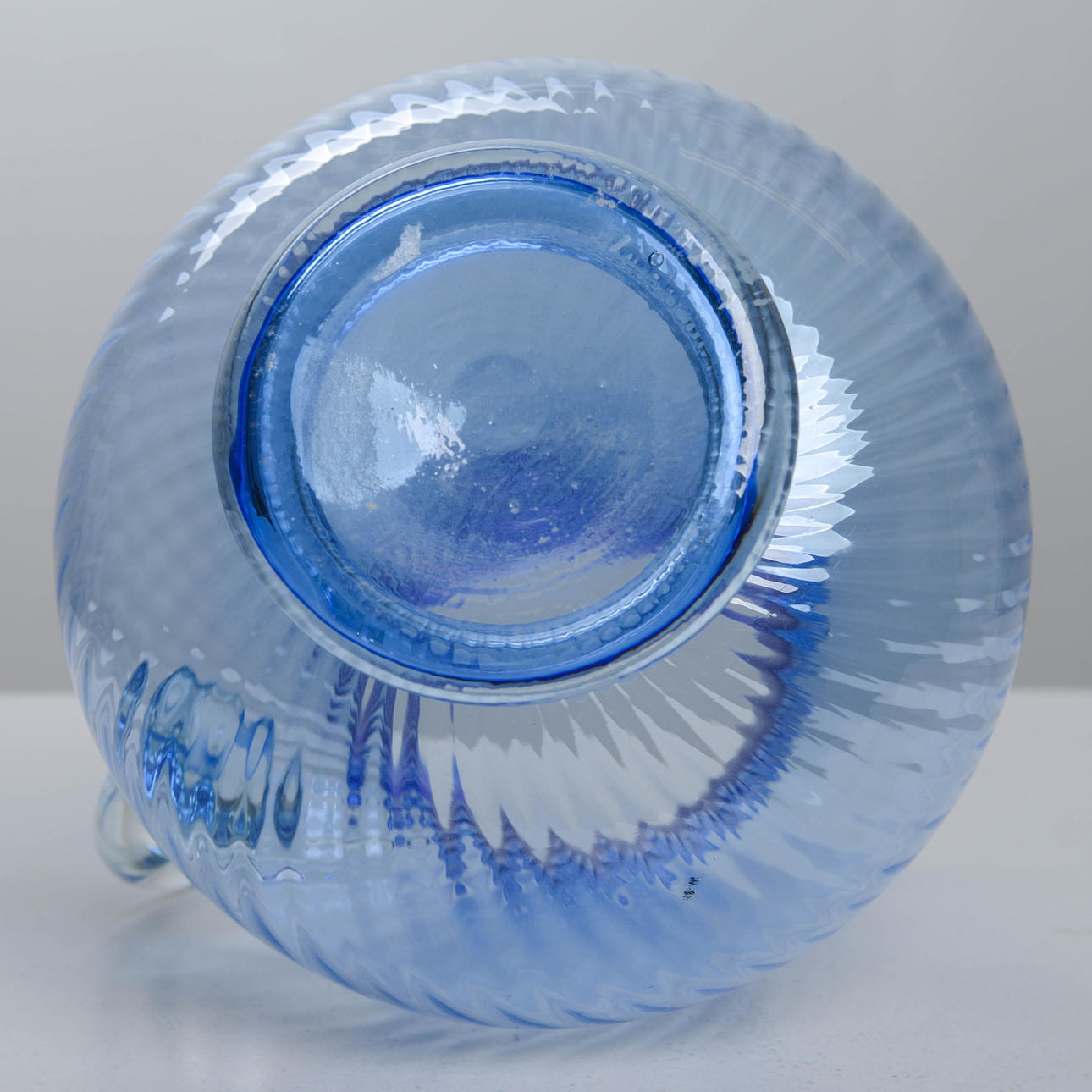 En masa de vidrio tintado azul con forma ligeramente torcida, mango en vidrio transparente.