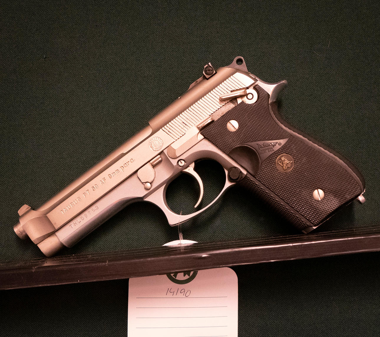 Pistola semiautomática brasileña marca Taurus modelo PT99 calibre 9x19. No adicional THL59763. Longitud del caño 12,5 cm. Mira ajustable. Cargador extraíble. El arma es completamente de acero inoxidable. Los lados del pistón son de goma.