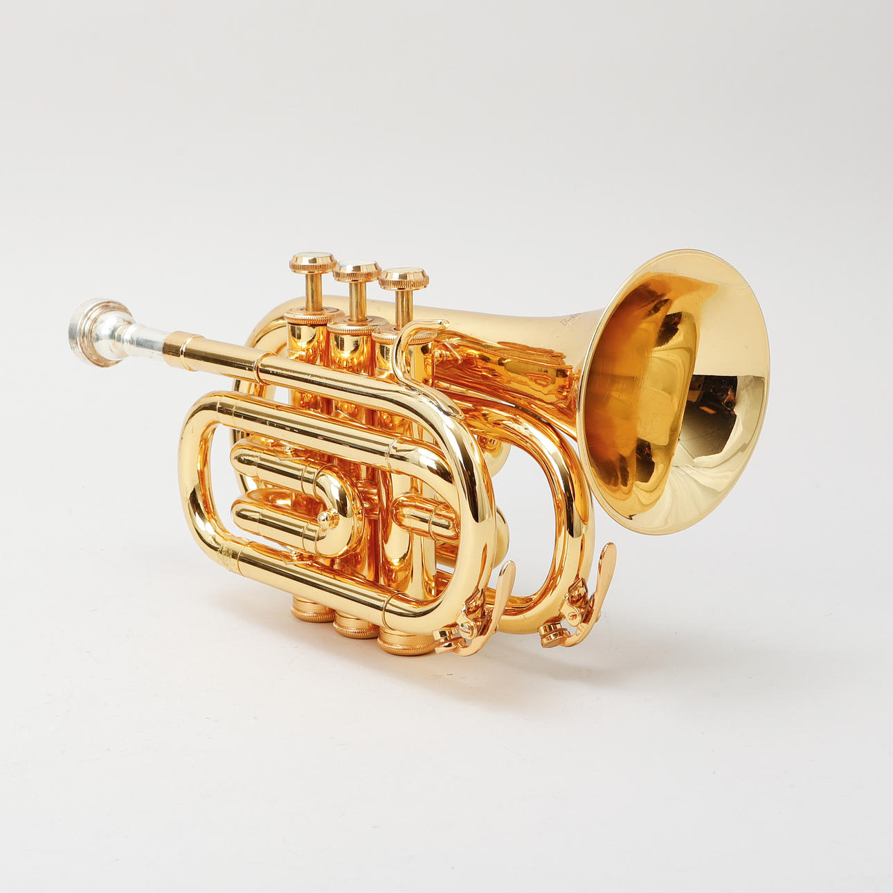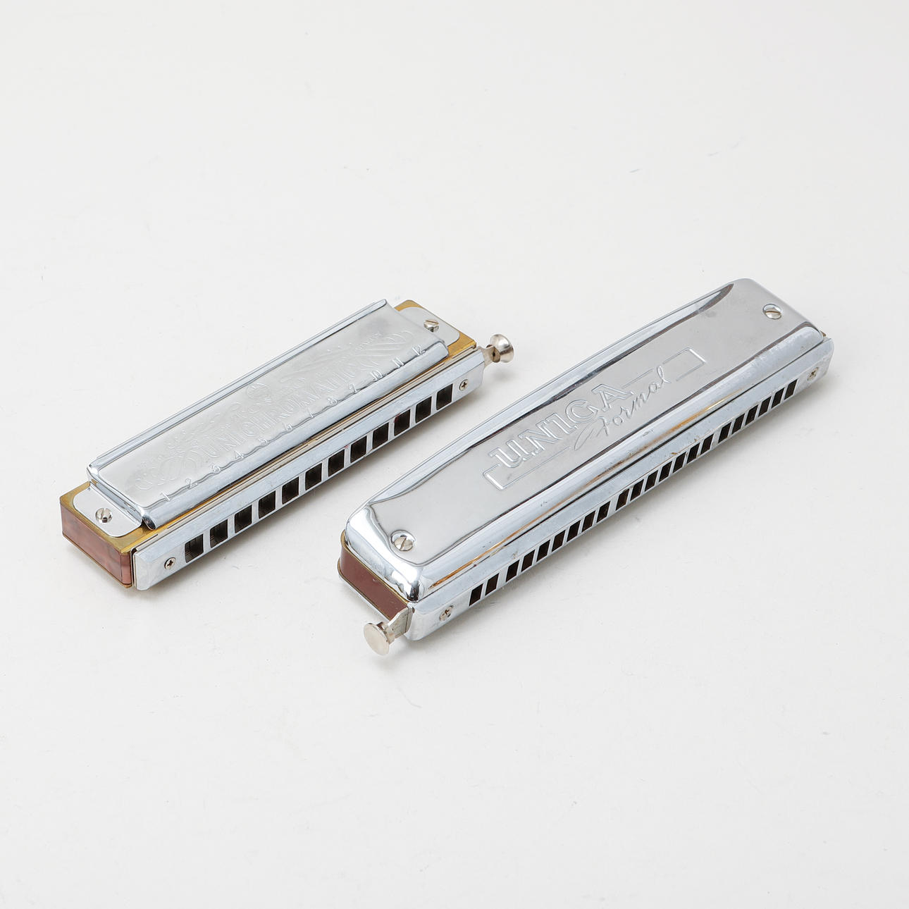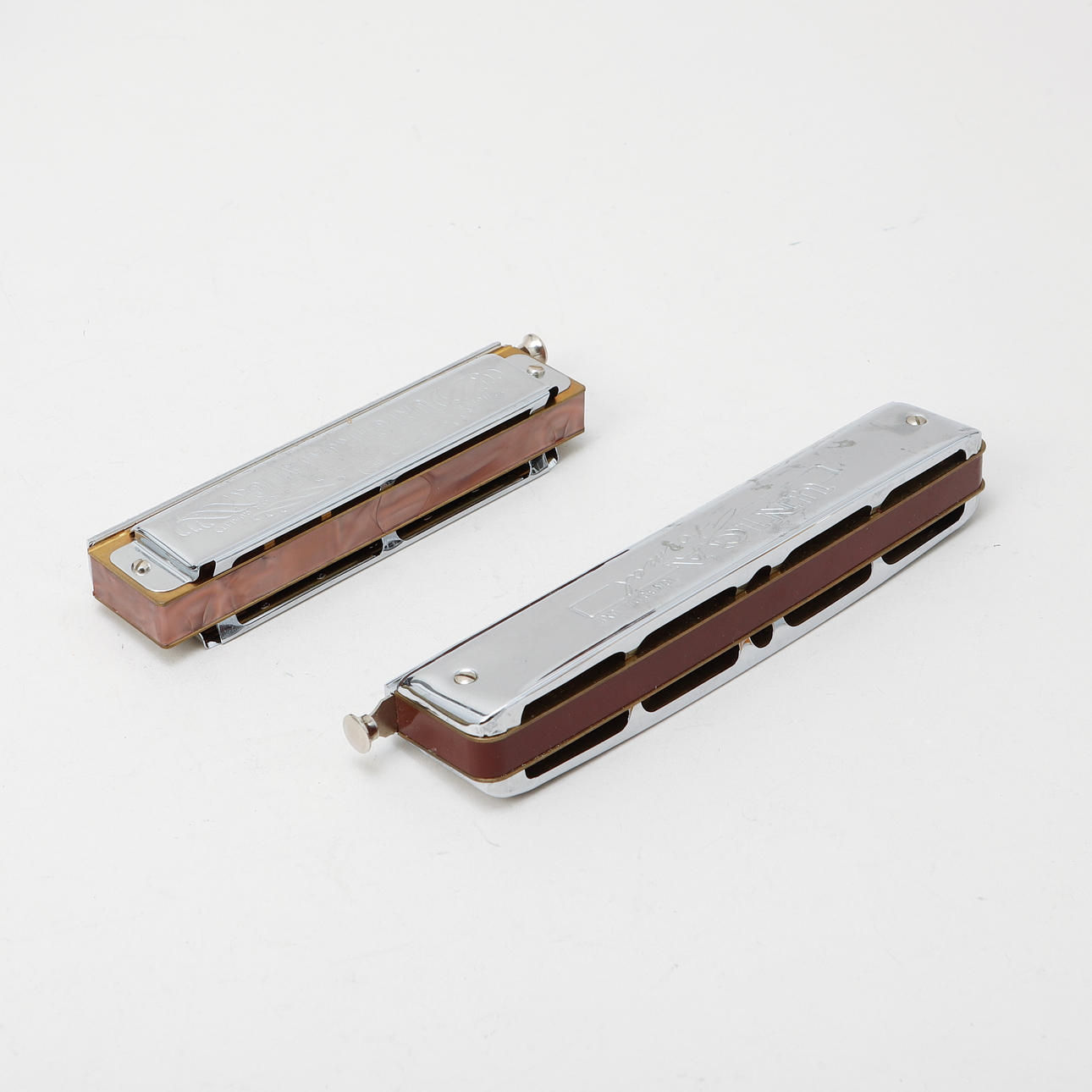 Trompeta, longitud 24 cm. Armónica, Tombo, Cromática. Longitud 14,5 cm Armónica, Tombo, De luxe, longitud 18,5 cm.