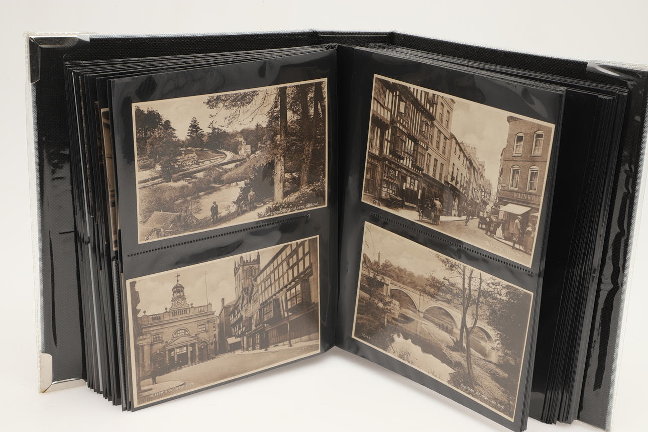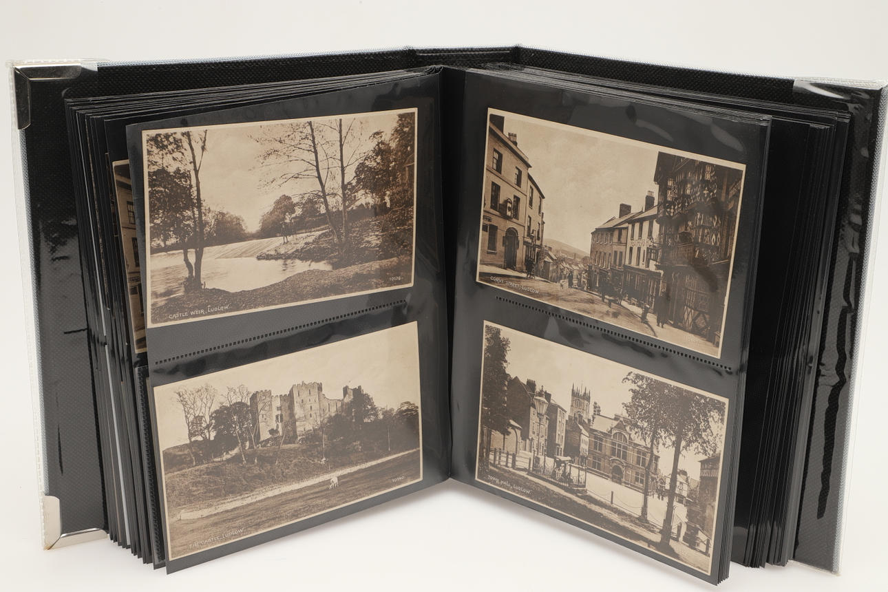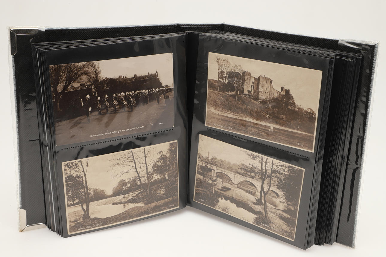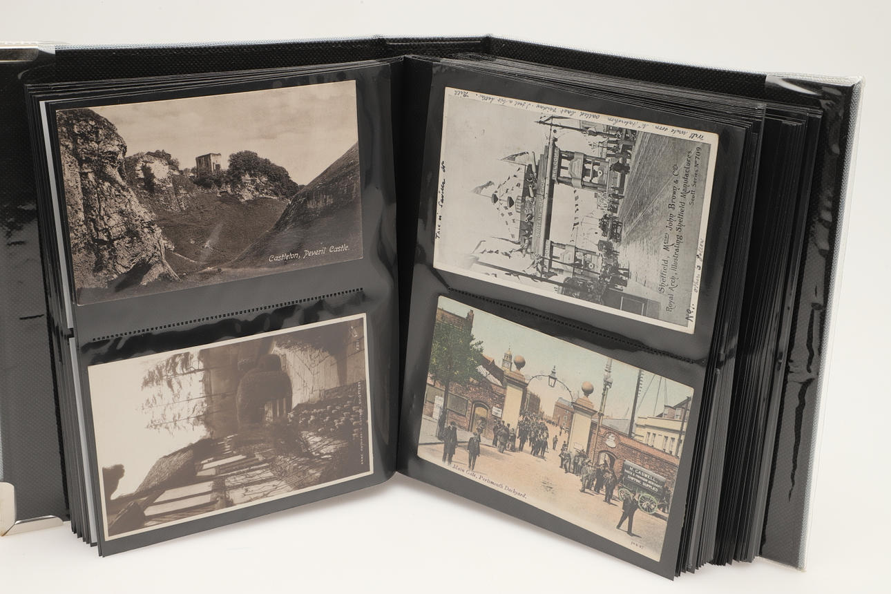 Dos álbumes con aproximadamente 104 postales, incluidas Rotheram (varias), Wickersley (varias), Carte de Visites, Portsmouth Dockyard, Victorias Anchor Southsea, Sheffield, Ludlow (varias) y otras postales. (2).