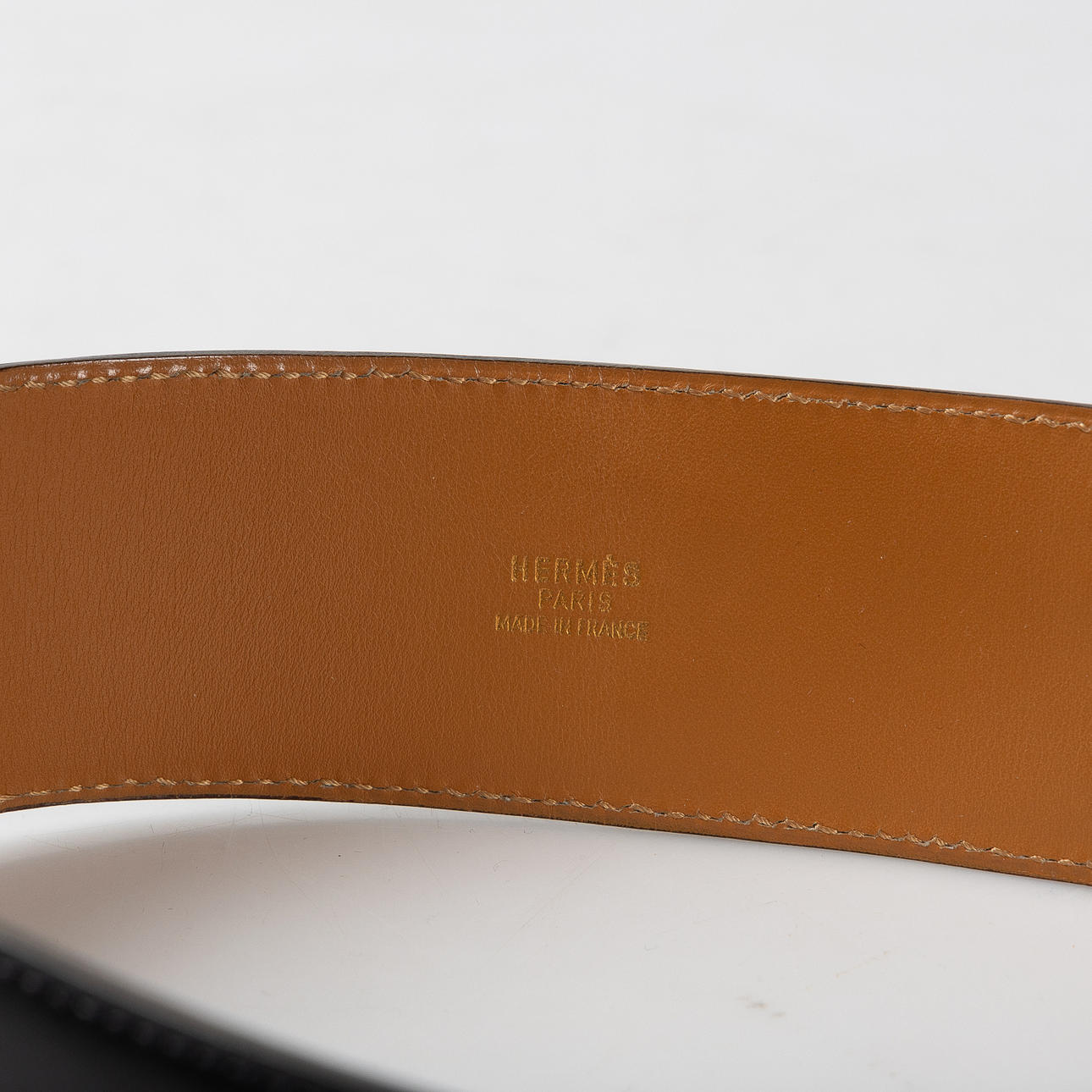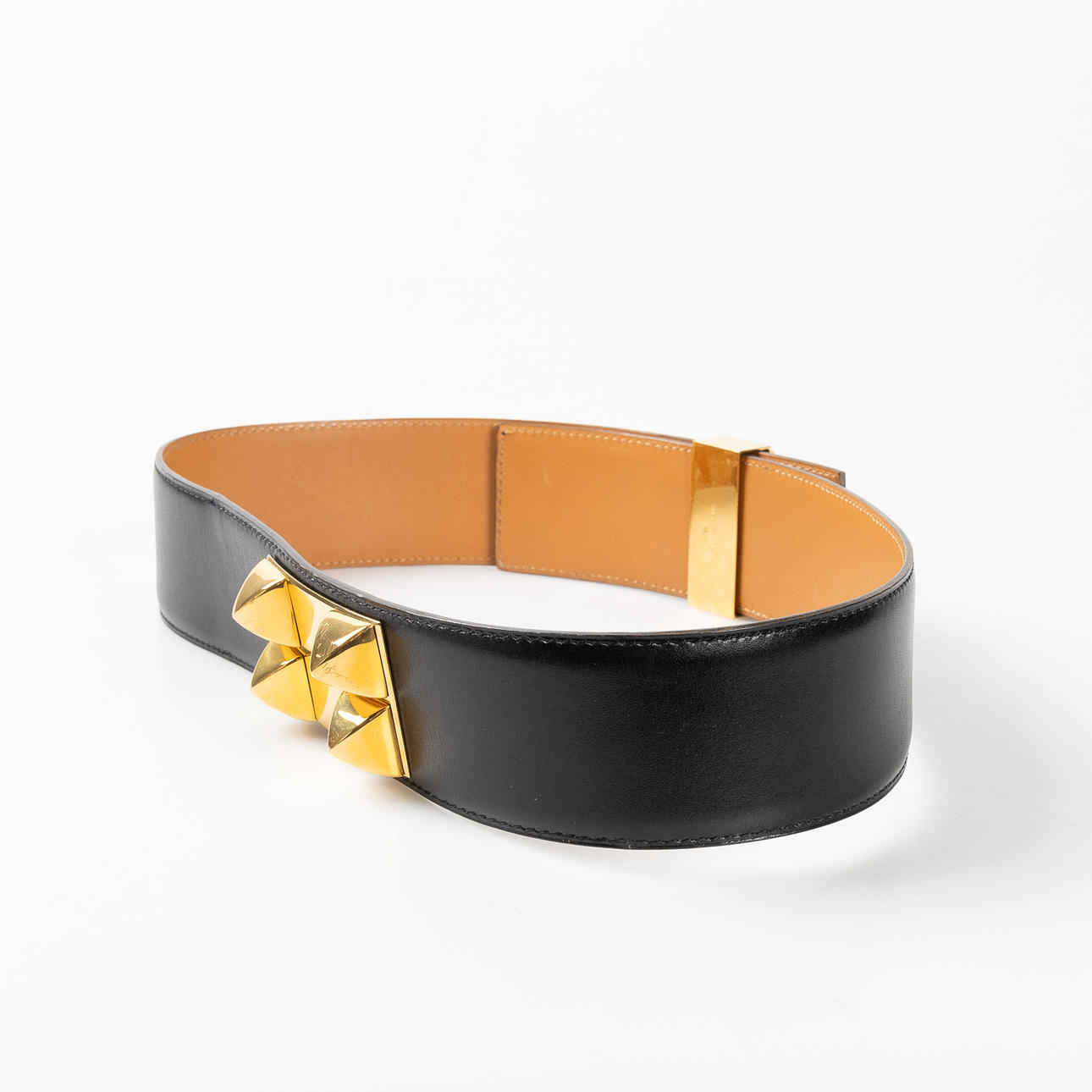 de piel de becerro negra con hebilla de metal amarillo. Ancho de unos 5 cm, circunferencia de unos 65-68 cm. Incluye bolsa para el polvo.