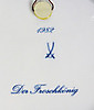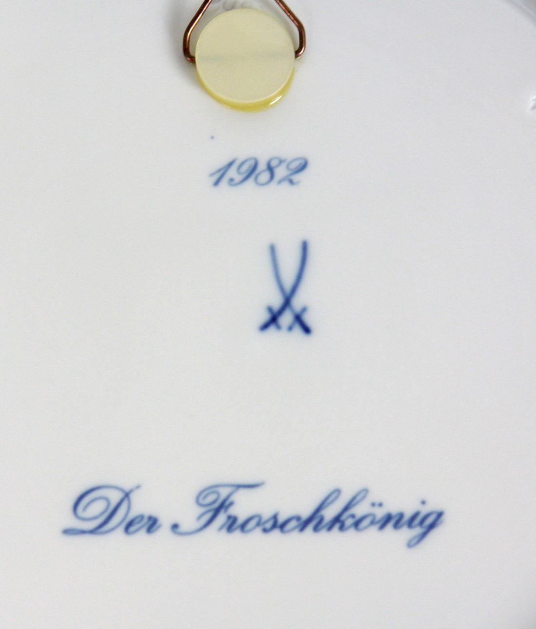 Porcelana con marca de espadas cruzadas azul bajo vidriado de la manufactura de porcelana de Meissen posterior a 1945, con grabado y número de pintor, 1. Wahl, inscripción *El rey rana* y *1982*, cupé de chapa de cantos lisos con la representación azul bajo vidriado del cuento de hadas El rey rana con princesa y Forsch delante del castillo, con un diámetro de aprox. 26 cm, en buen estado.