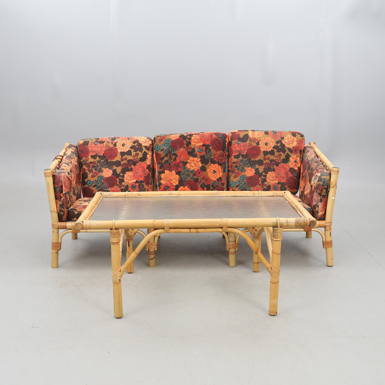 4069751. SOFÁ Y MESA DE JARDÍN, bambú/vidrio, años 70.