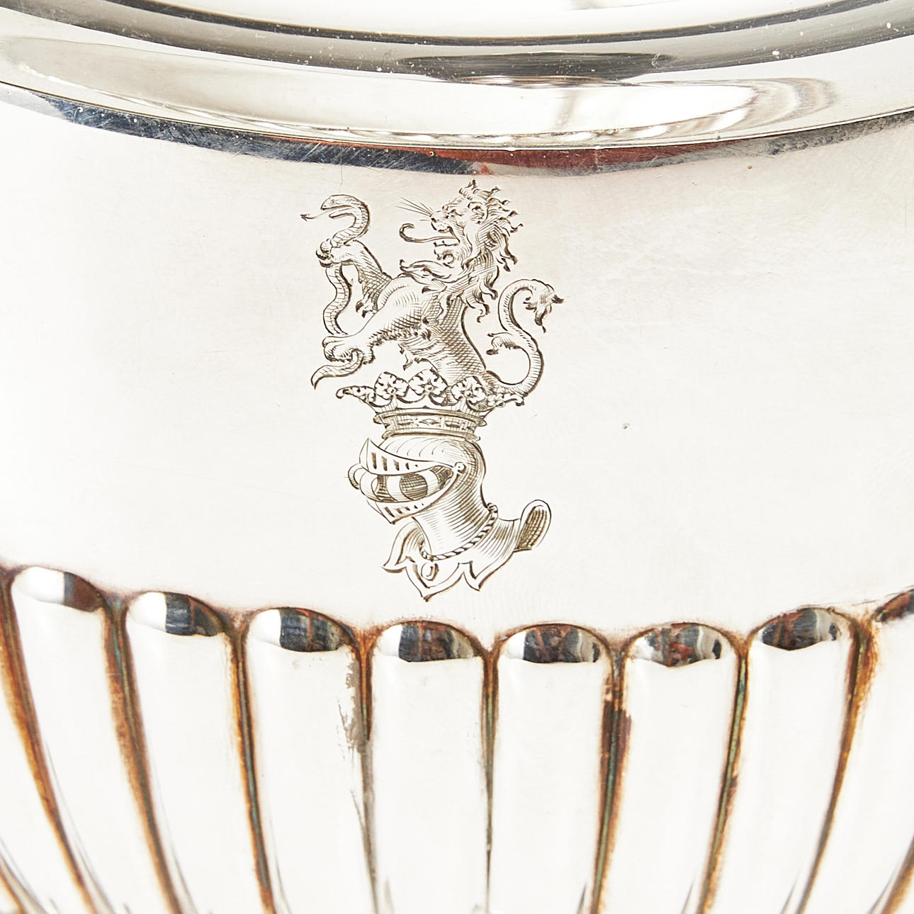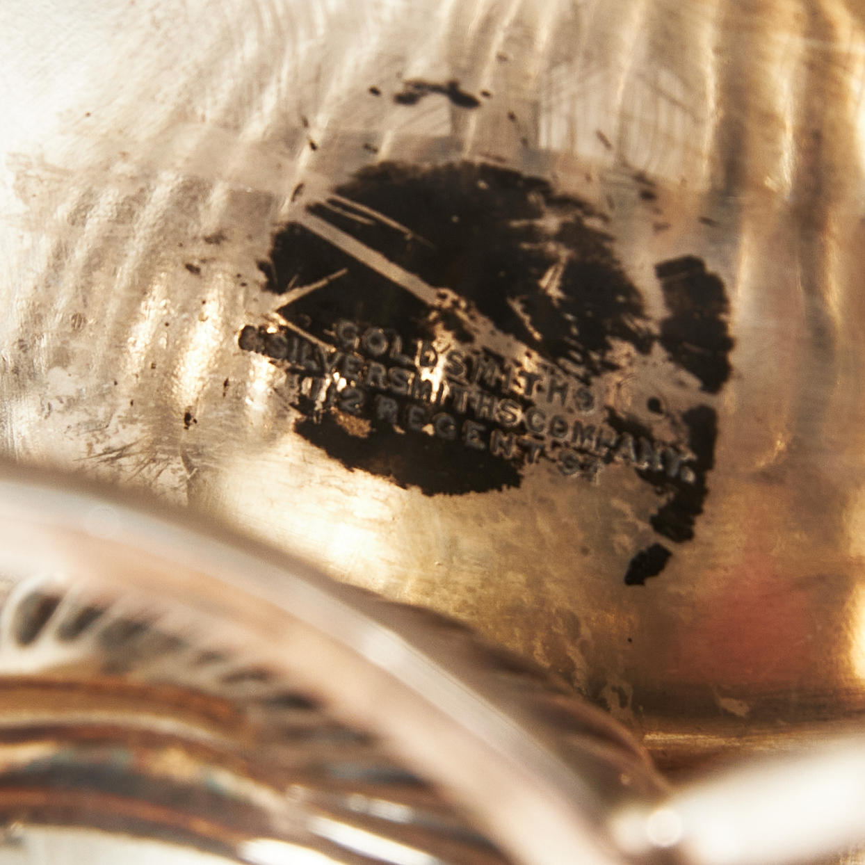 Tetera estampada Goldsmiths & Silversmiths Company, 112 Regent St, soporte de tinta de aproximadamente 32 x 22 cm, barandilla de madera ennegrecida, grabada con escudo.