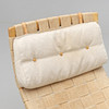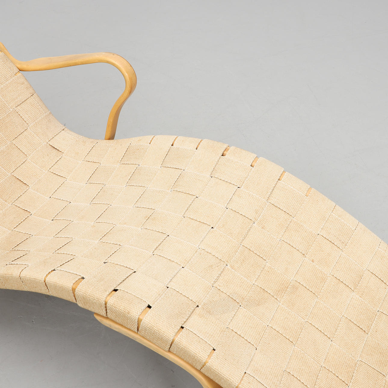 Estructura en madera de haya, asiento en tela de sillín trenzada. Almohada holgada para el cuello en lona beige. Anchura 64, longitud 170, altura 90 cm.