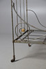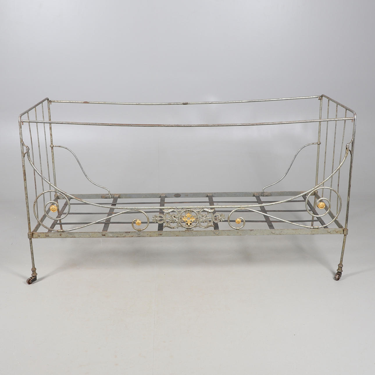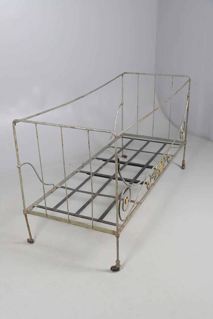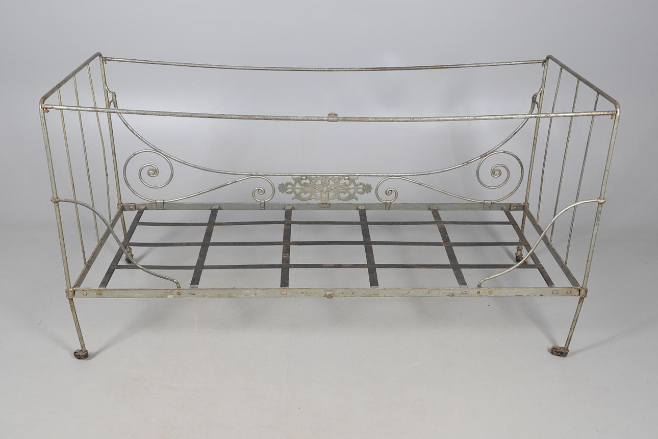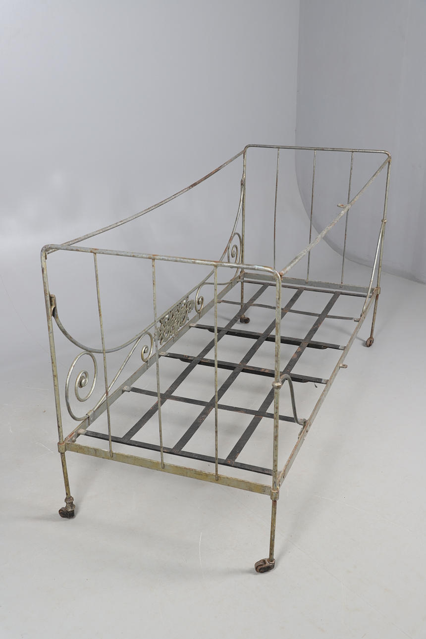 Un diván francés de hierro forjado, con un lado perforado en forma de rollo y apoyado sobre ruedas de metal. 159 cm x 63 cm, 86,5 cm de alto.