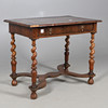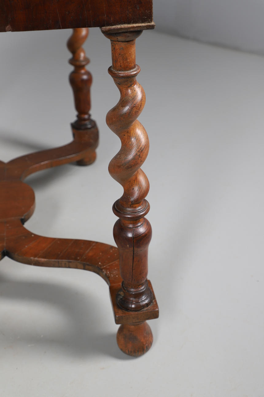 Con una parte superior moldeada, un solo cajón y apoyada en patas torcidas de cebada y camillas en forma de cruz. 84 cm x 55 cm, 70 cm de alto.