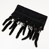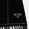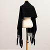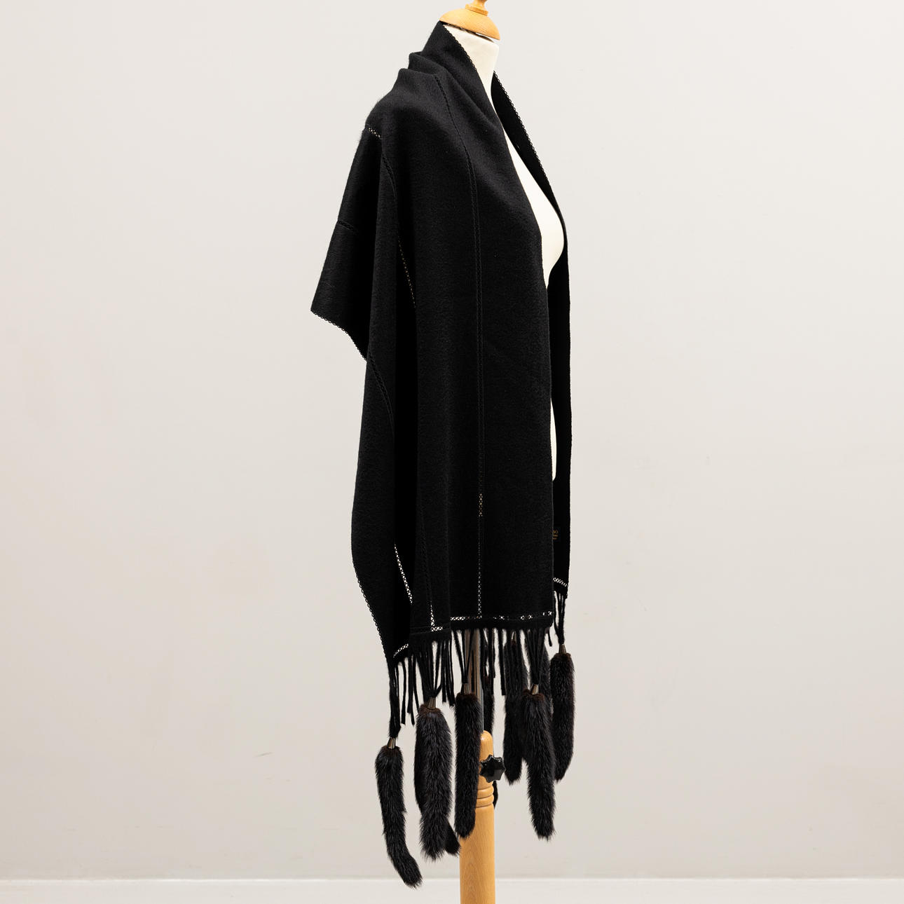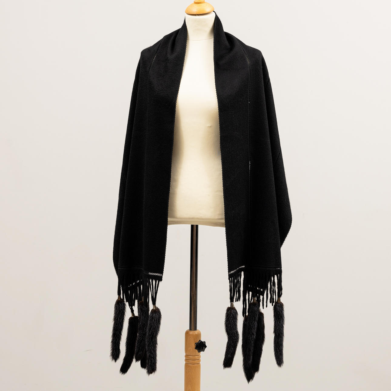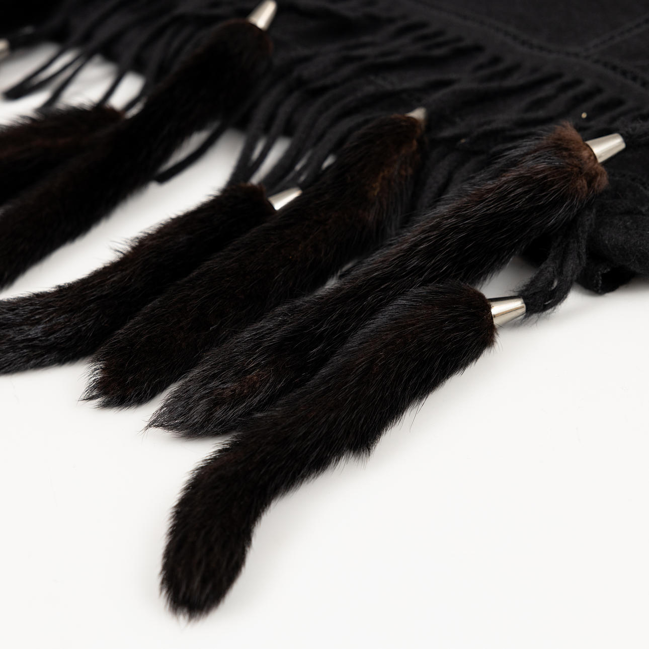 Cachemir negro con rayas decorativas caladas y ribete francés con largas colas de visón, marca COLOMBO PURE CASHMERE TEJIDA EN ITALIA.