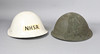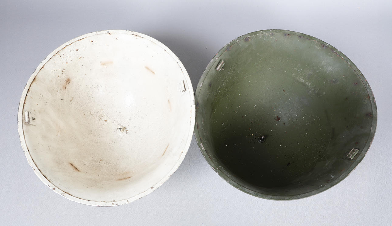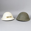 Dos cascos británicos de acero MK IV posteriores a la Segunda Guerra Mundial, uno registrado en la NHSR (Reserva Nacional de Servicios Hospitalarios).