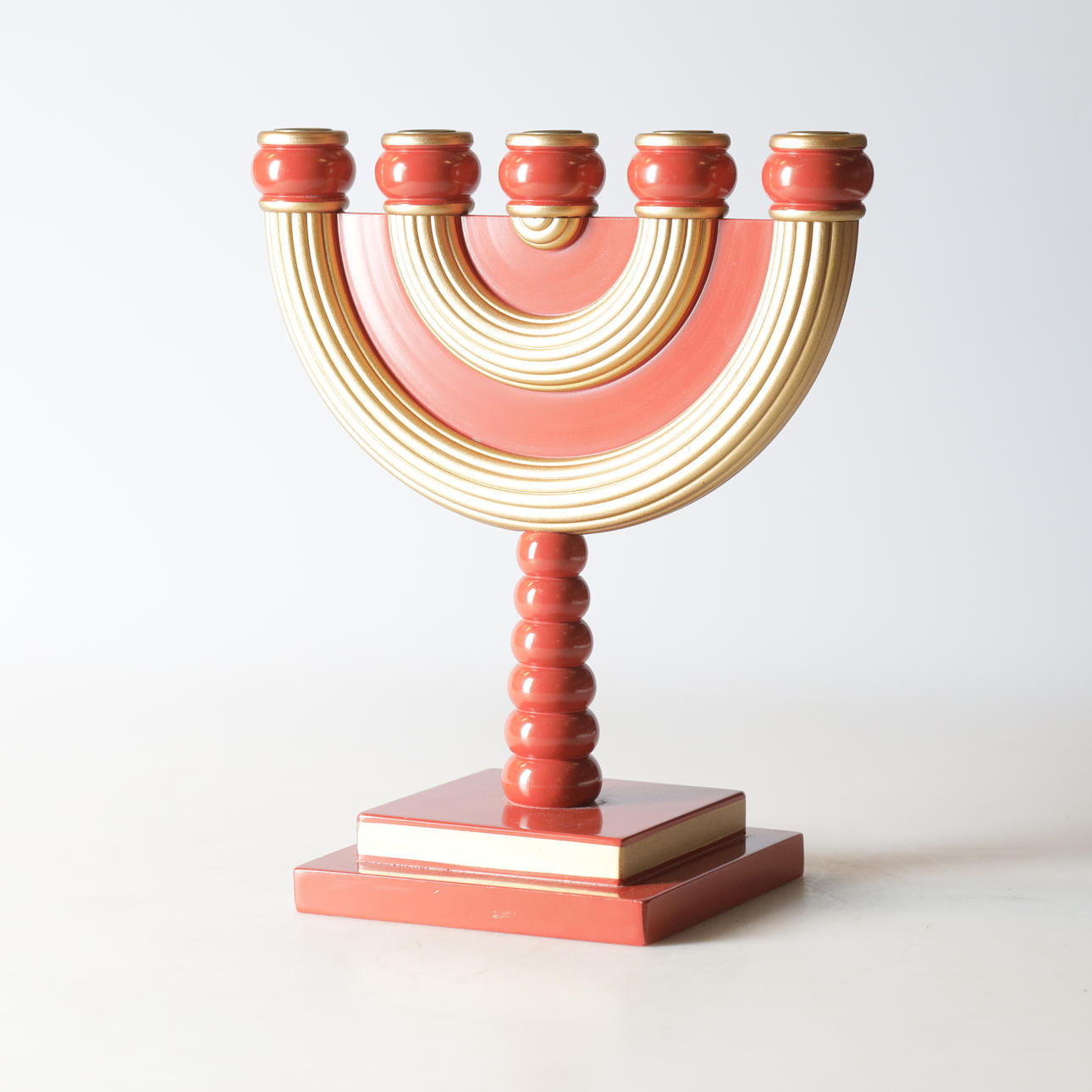 Candelabro de madera lacada, con soporte para cinco velas Altura 34, longitud 29 cm.