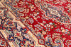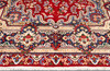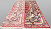 Color base rojo, medallón central y adornos azules en las esquinas que envuelven la vegetación. La alfombra tiene una decoración de flora y vegetación estilizada.
