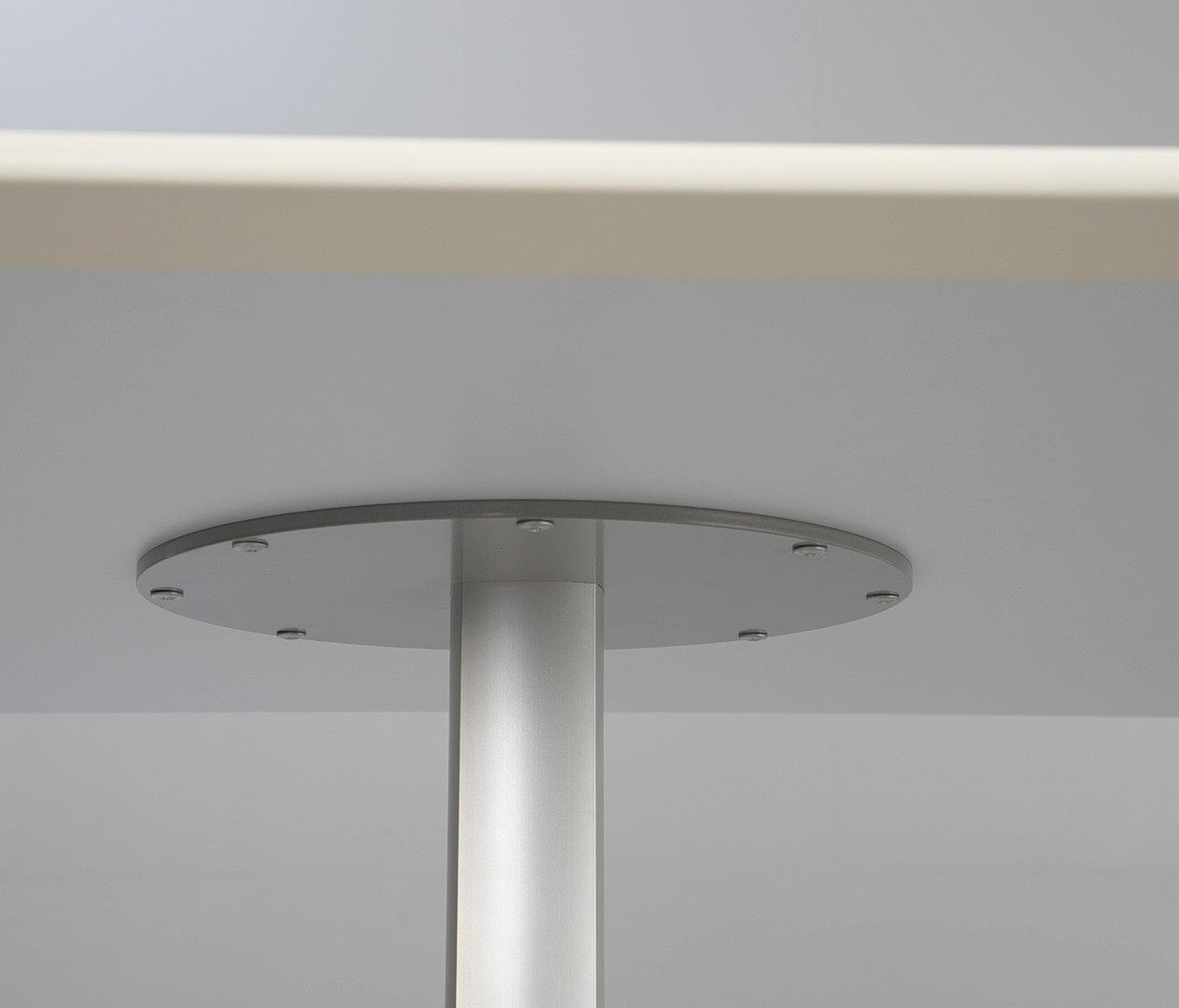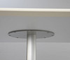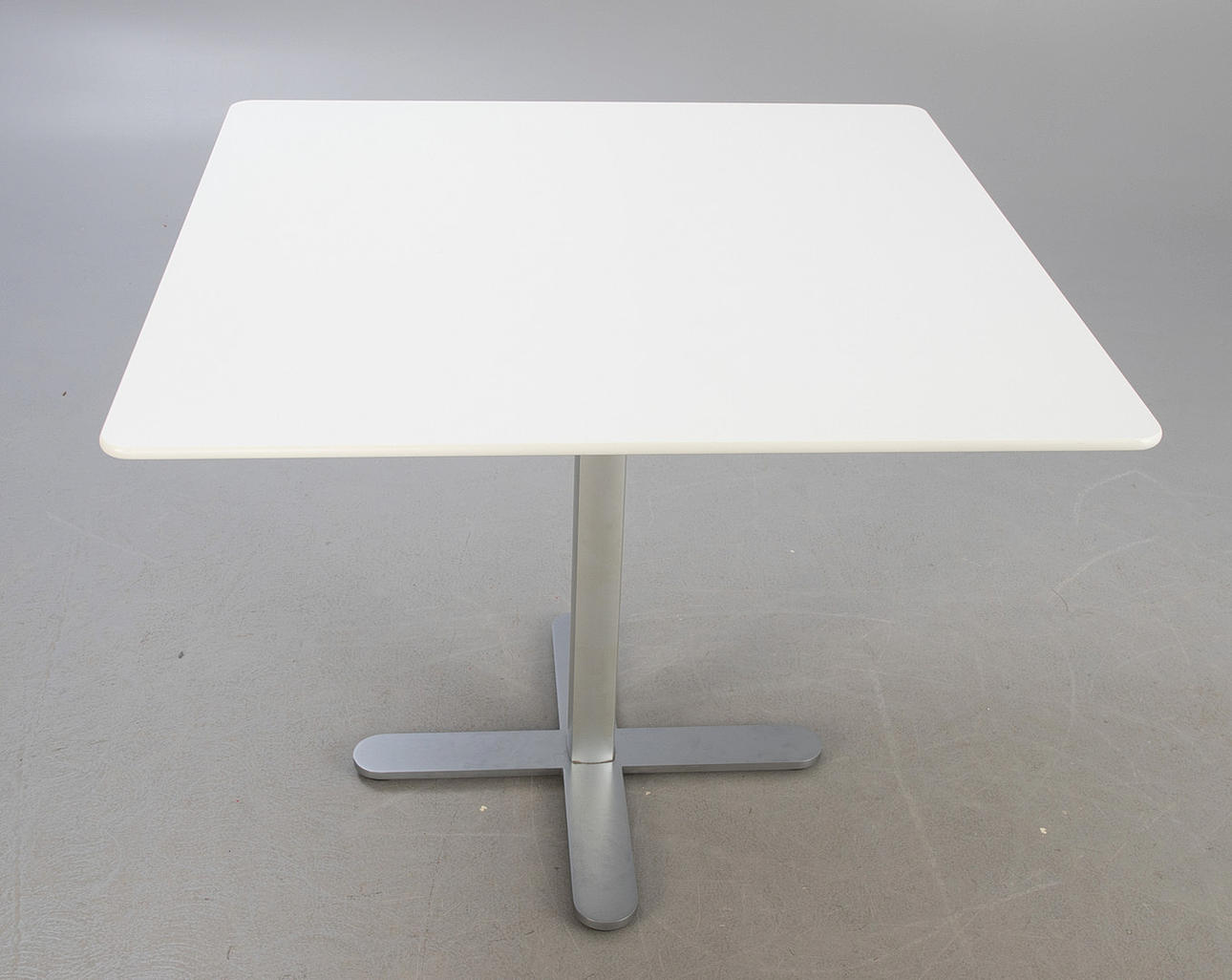 Base de acero cromado mate, tablero cuadrado laminado blanco (color: snow 38). Dimensiones aproximadas Altura 72 cm x 90 cm x 90 cm.