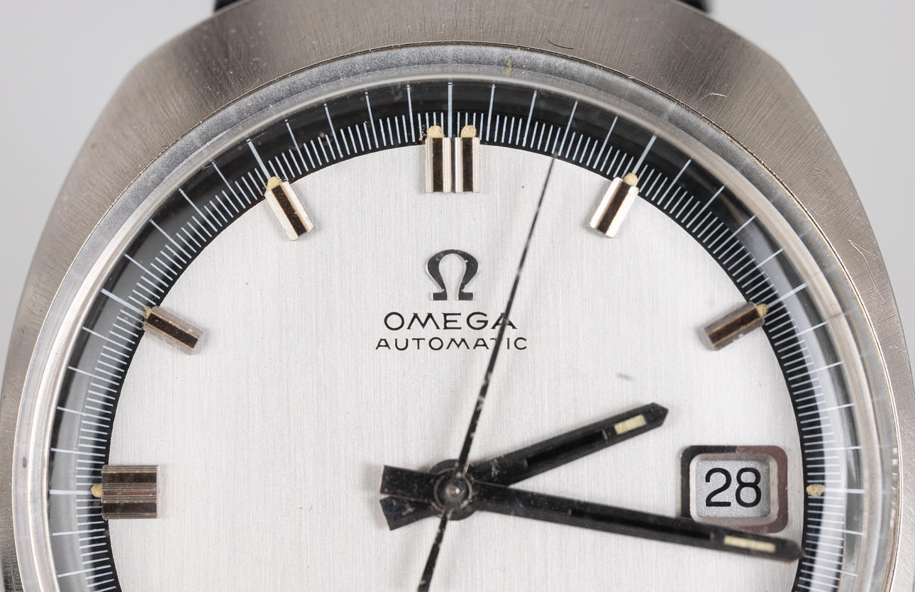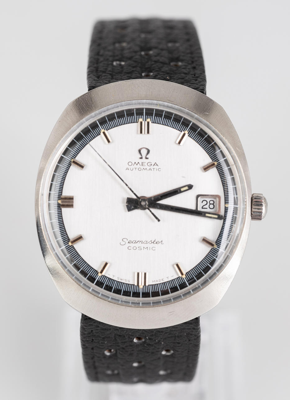 Reloj Omega, modelo «Cosmic», caja de acero inoxidable, esfera plateada con manecillas de minutos, horas y segundos, reloj con fecha en 3 pulgadas, cristal de plástico, pulsera con hebilla, movimiento automático. Dimensiones aproximadas 35 mm x 40 mm El tiempo corría en el momento de la revisión, la tienda de subastas de Estocolmo no garantiza la funcionalidad.