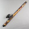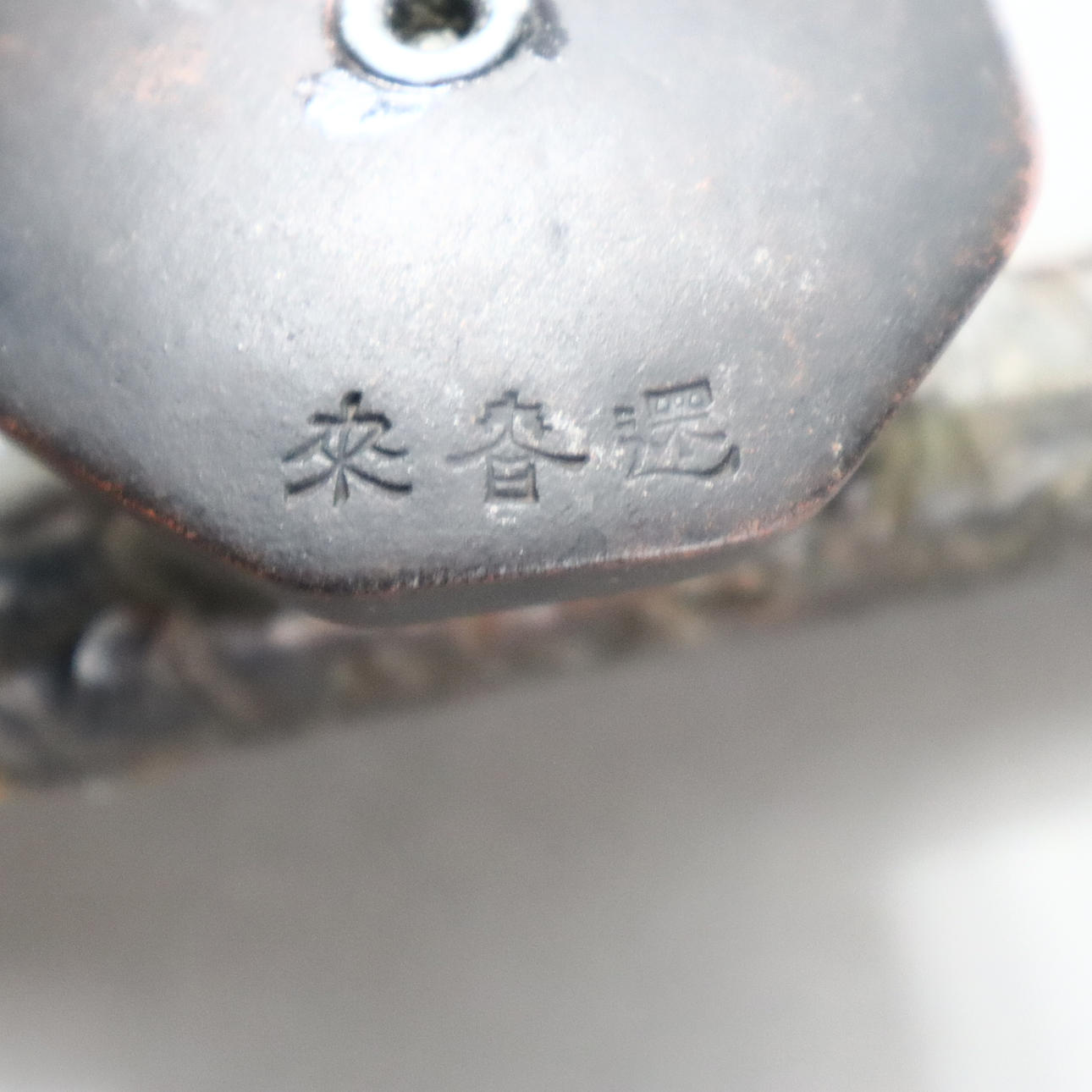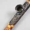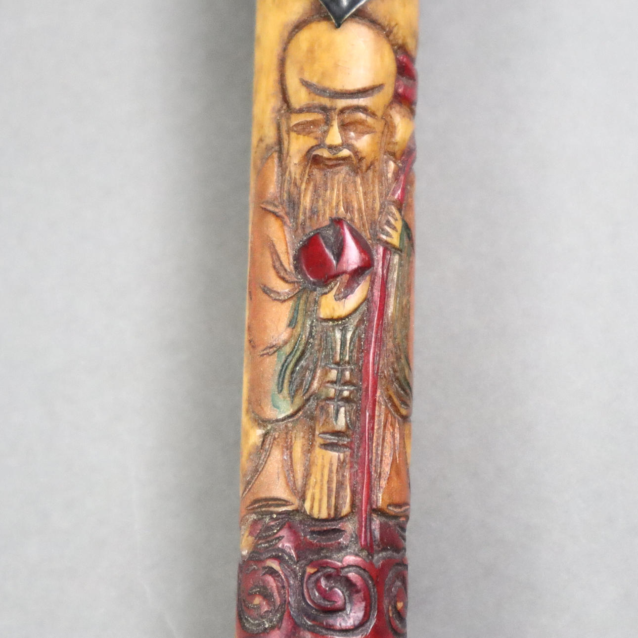 Pipa de opio: porcelana, cuerno/madera, compuesta por cinco segmentos de cuerno, finamente tallados con imágenes y personajes de San Xing, pintados en color, piezas finales de madera, soporte de metal con decoración en relieve, restos de sustancias en el interior, aproximadamente 47 cm.