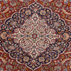 Alfombra anciana anudada a mano en lana sobre urdimbre de algodón, medallón sobre base sobreestampada de color rojo óxido.