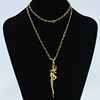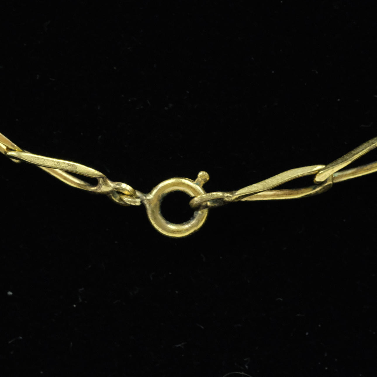 En forma de figuras abrazadas, metal amarillo, altura 8 cm. Cadena, longitud 69 cm.
