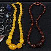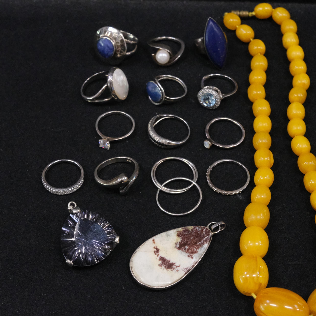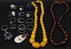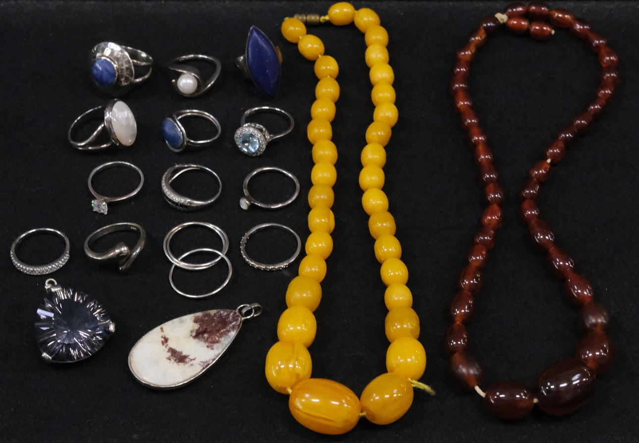 13 anillos de plata, de los cuales 11 con piedras, tamaño 17-19 mm, dos colgantes de plata con piedras y dos collares de ámbar.