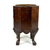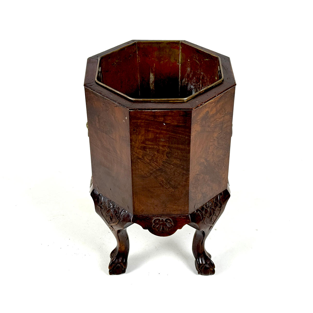 Una maceta antigua chapada en nogal octogonal revestida de latón, 45 cm de altura.