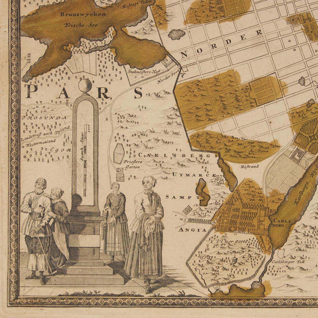 Mapa grabado parcialmente coloreado (colorita antiguo) con dos cartuchos figurativos en blanco y negro. Borde de chapa aprox. 490x580 mm. Toda la hoja mide unos 535x640 mm.