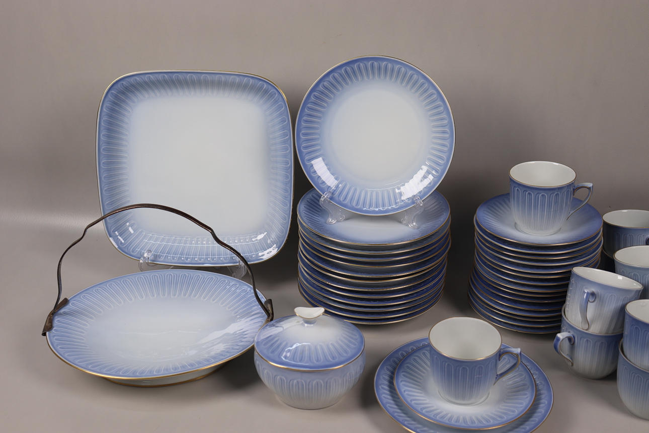 16 tazas de café 16 platillos de café 14 guarniciones, 18 cm de diámetro 2 barriles, el más grande de 23,5 x 23,5 cm. 1 azucarero con tapa.