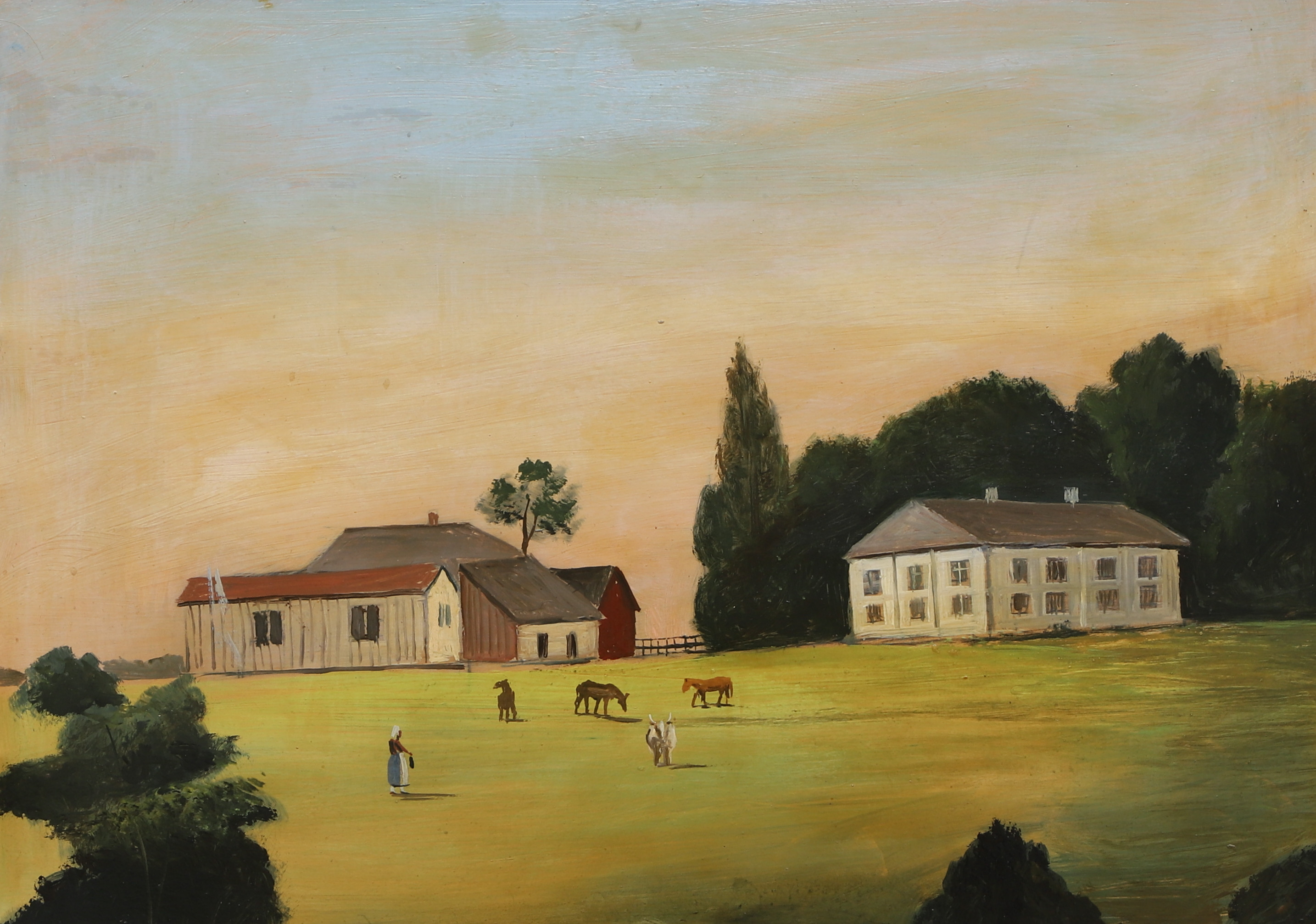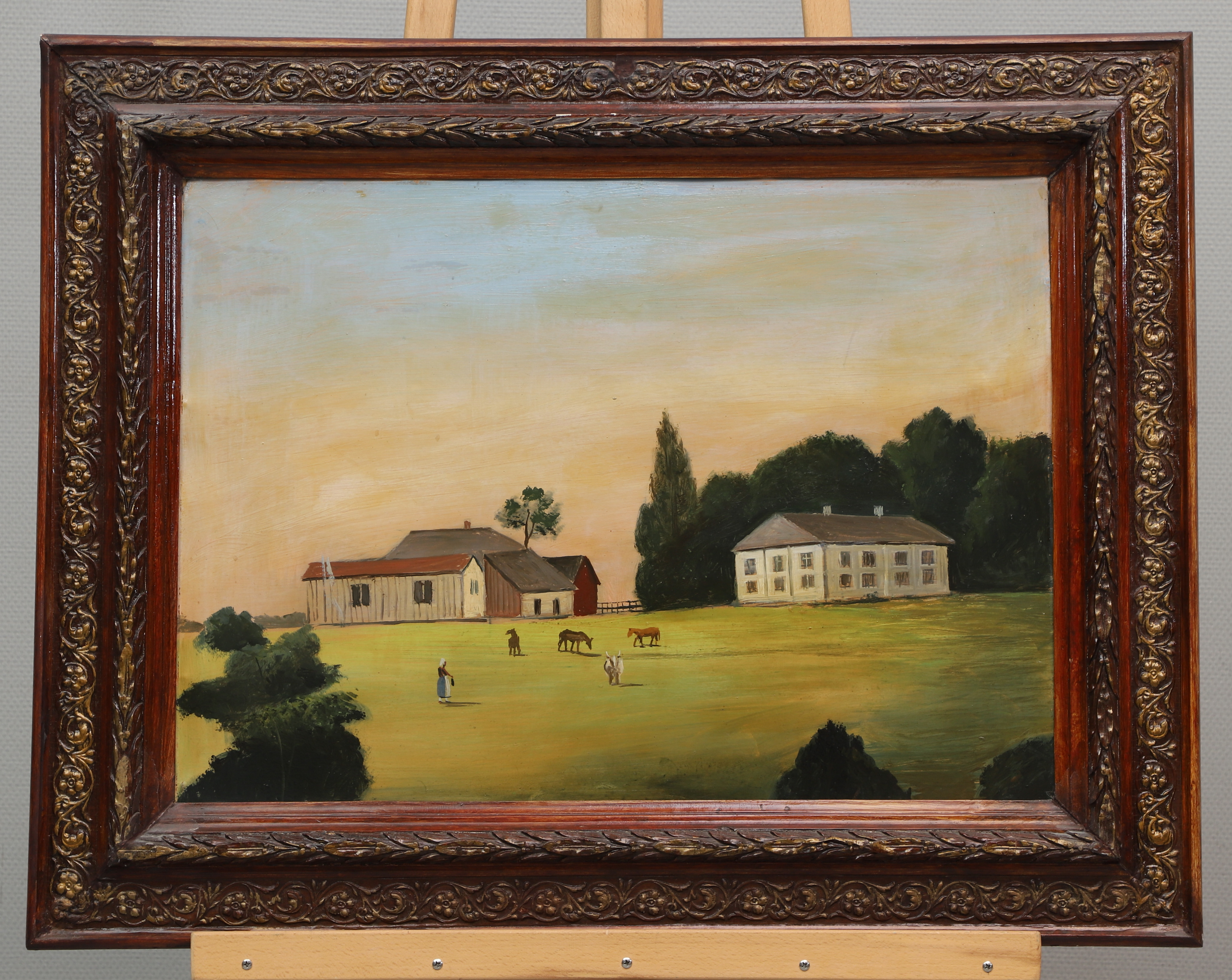 4238017. OKÄND KONSTNÄR. Óleo sobre tabla, caserío.