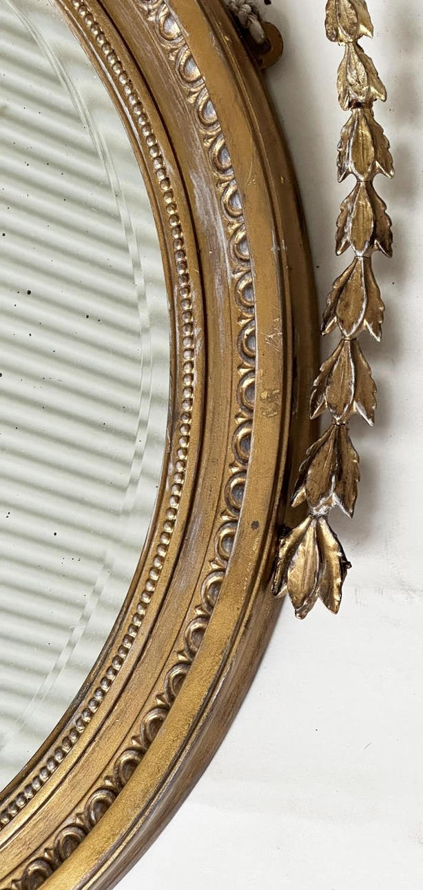 Madera dorada y yeso estilo Robert Adam de principios del siglo XX, circular con decoración de cascarilla y cinta, 77 cm de alto x 62 cm de ancho.