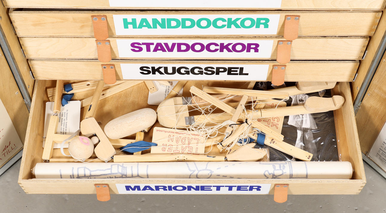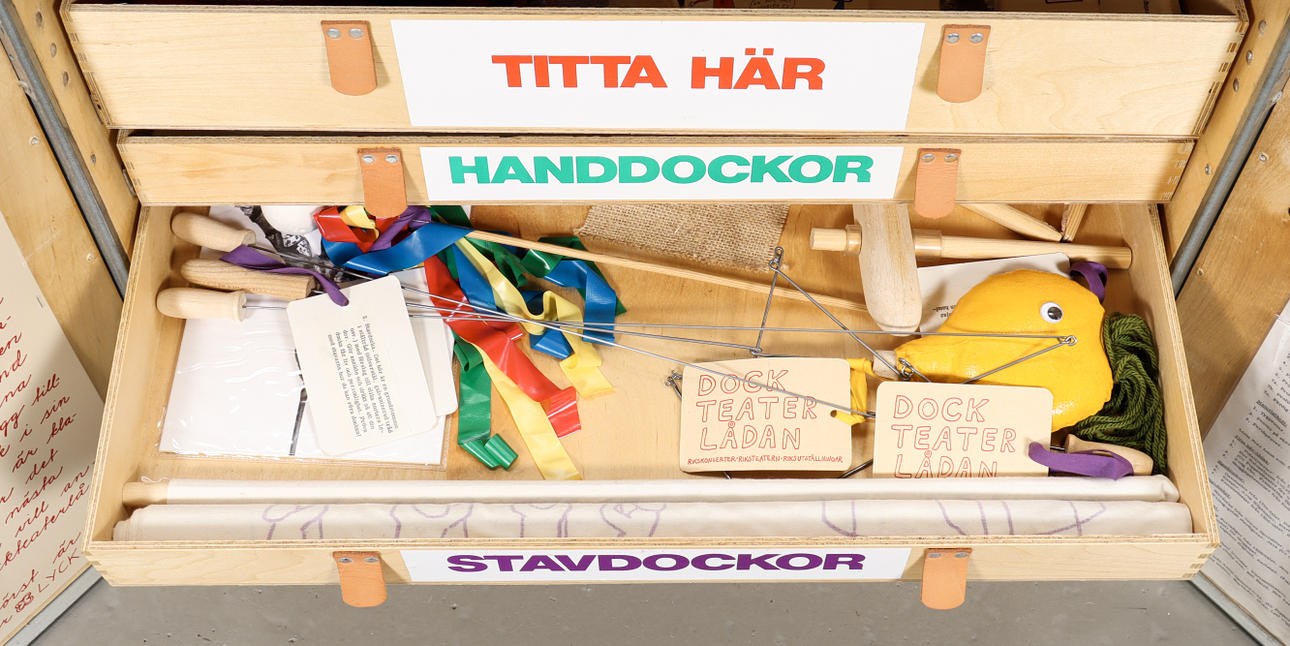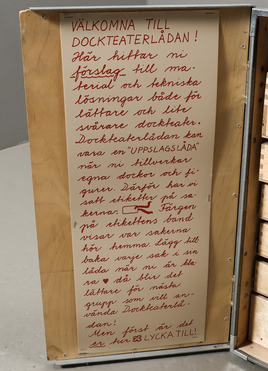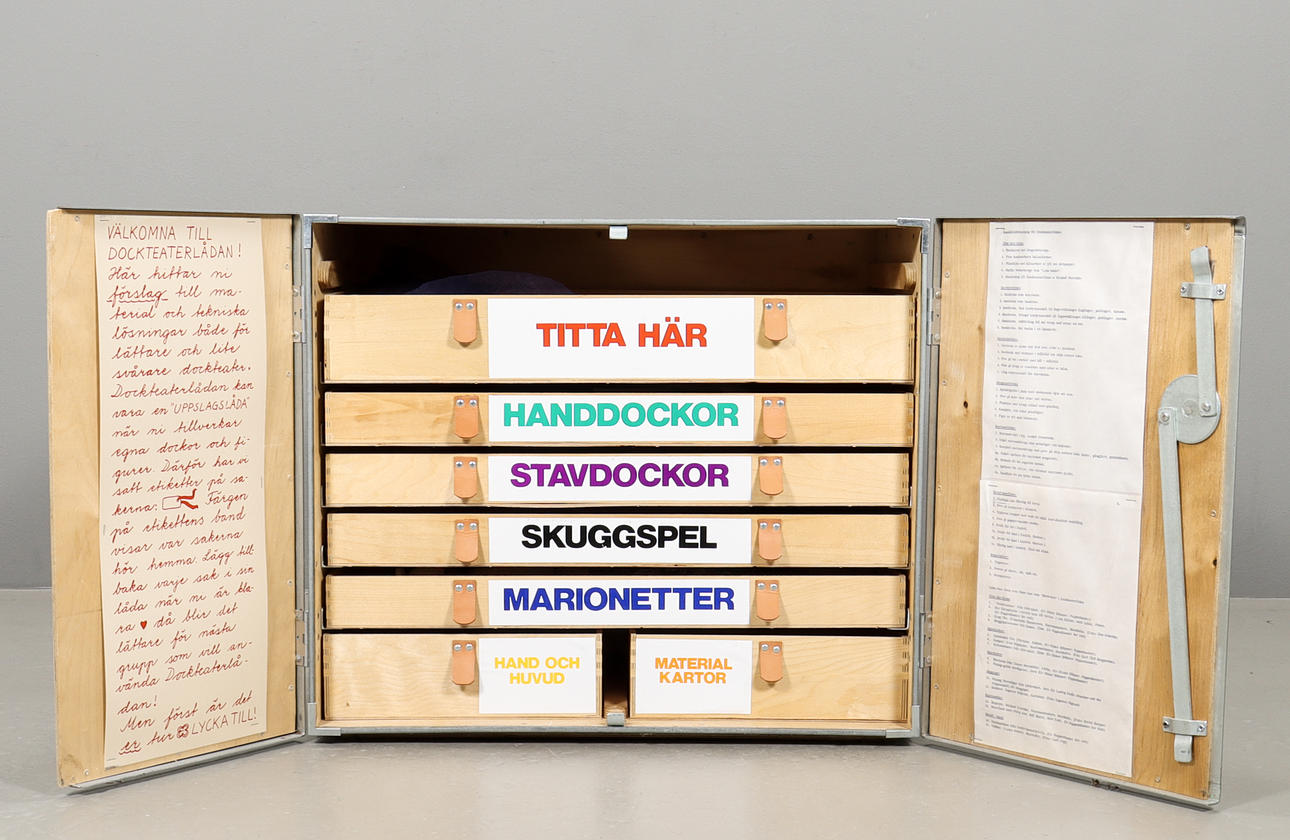 Caja de madera decorada con cajas, contiene materiales de teatro de marionetas de Riksteatern.