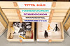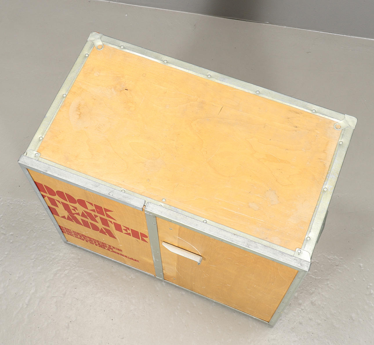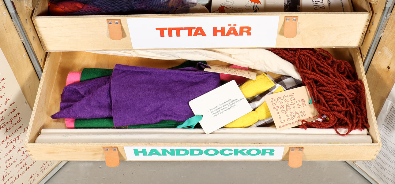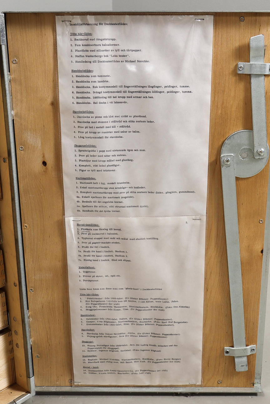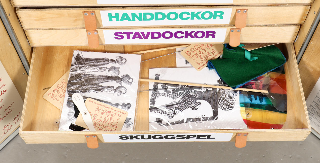 Caja de madera decorada con cajas, contiene materiales de teatro de marionetas de Riksteatern.