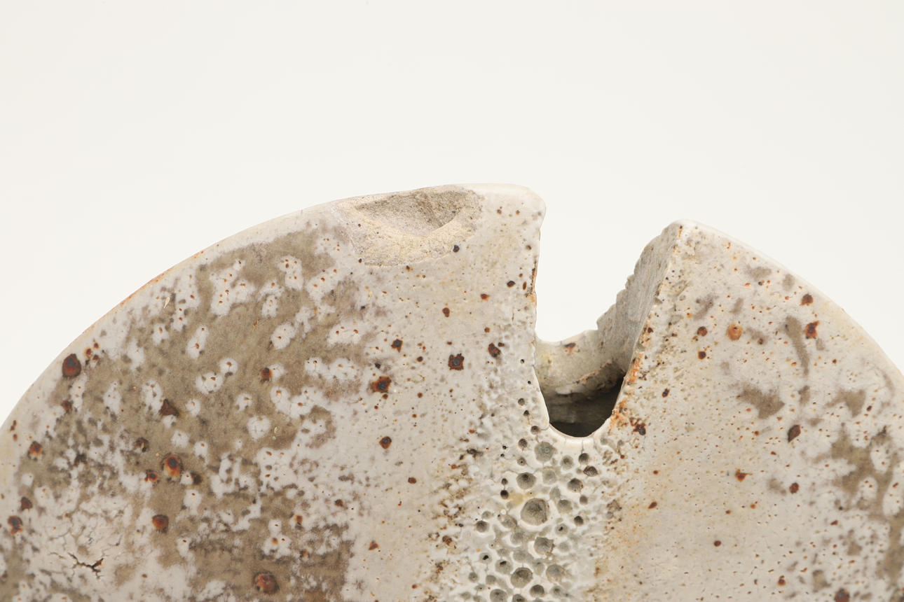 Un jarrón dividido de forma ovoide aplanada, con un esmalte pálido y una banda vertical en el centro. Firmado en la base con las iniciales «AW». 24 cm de alto.