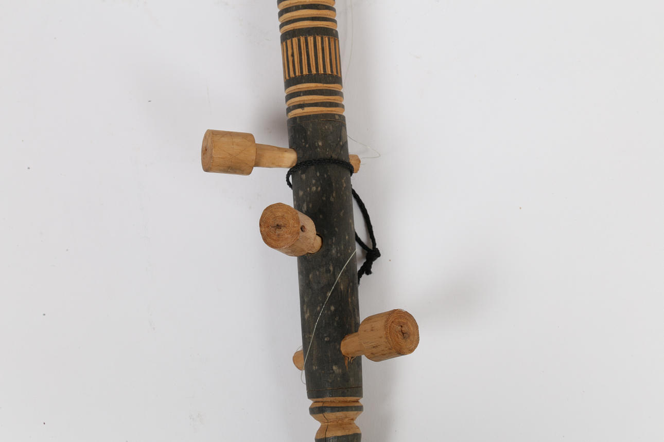 El cuerpo de carey está montado sobre un mástil de madera tallada, tres clavijas de afinación y una membrana de piel con la inscripción «Tangier Aug '63» escrita con tinta debajo del puente, de 56 cm de longitud.