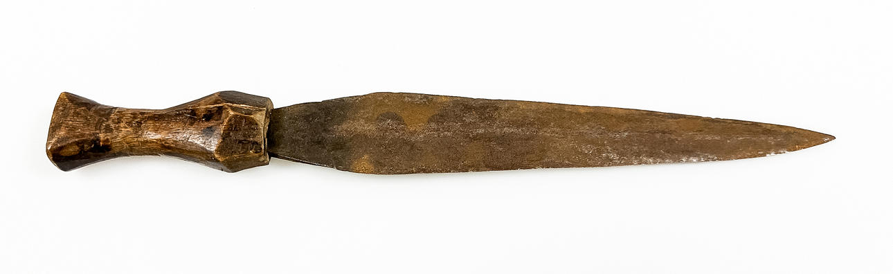 Puña/cuchillo en tina de madera con exterior trenzado. Longitud de la daga aprox. 31 cm.