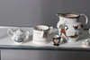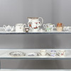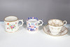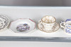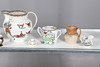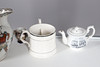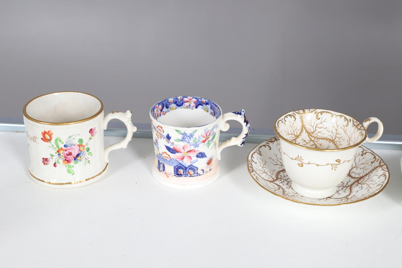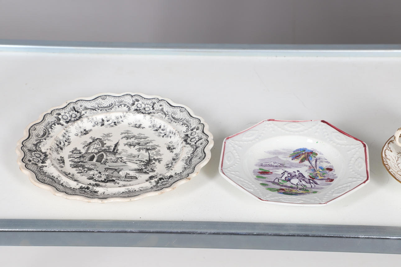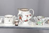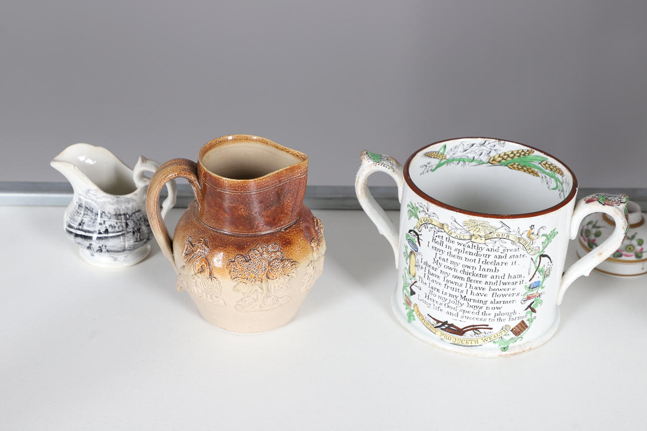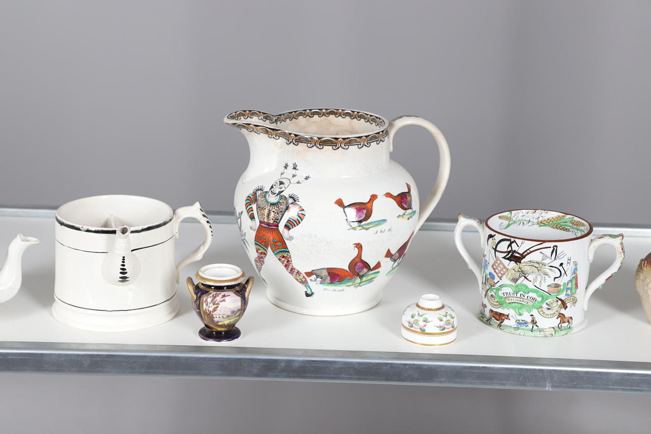 Incluye una jarra impresa por transferencia con imágenes de peleas de gallos, animales y figuras de arlequines (19 cm de altura), una jarra de granjero con dos asas (10 cm de altura), una jarra con la inscripción «Henry Shapcott, East Looe 1858» (8 cm de altura) y varios otros artículos. Algunos daños.