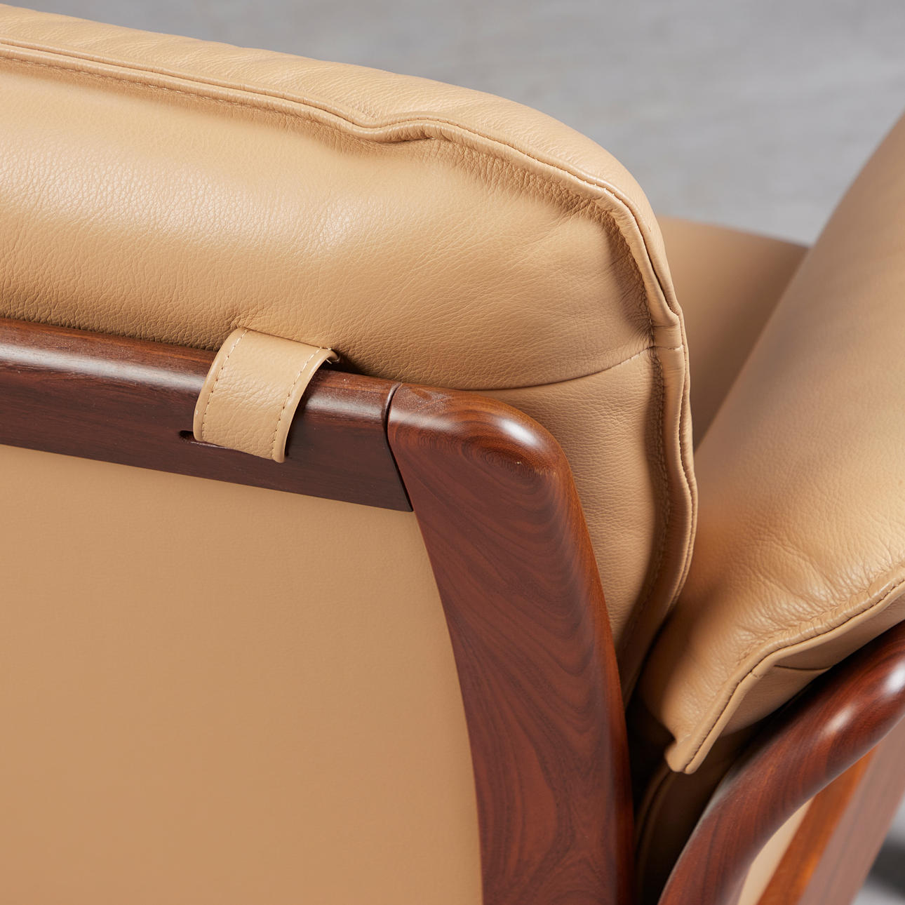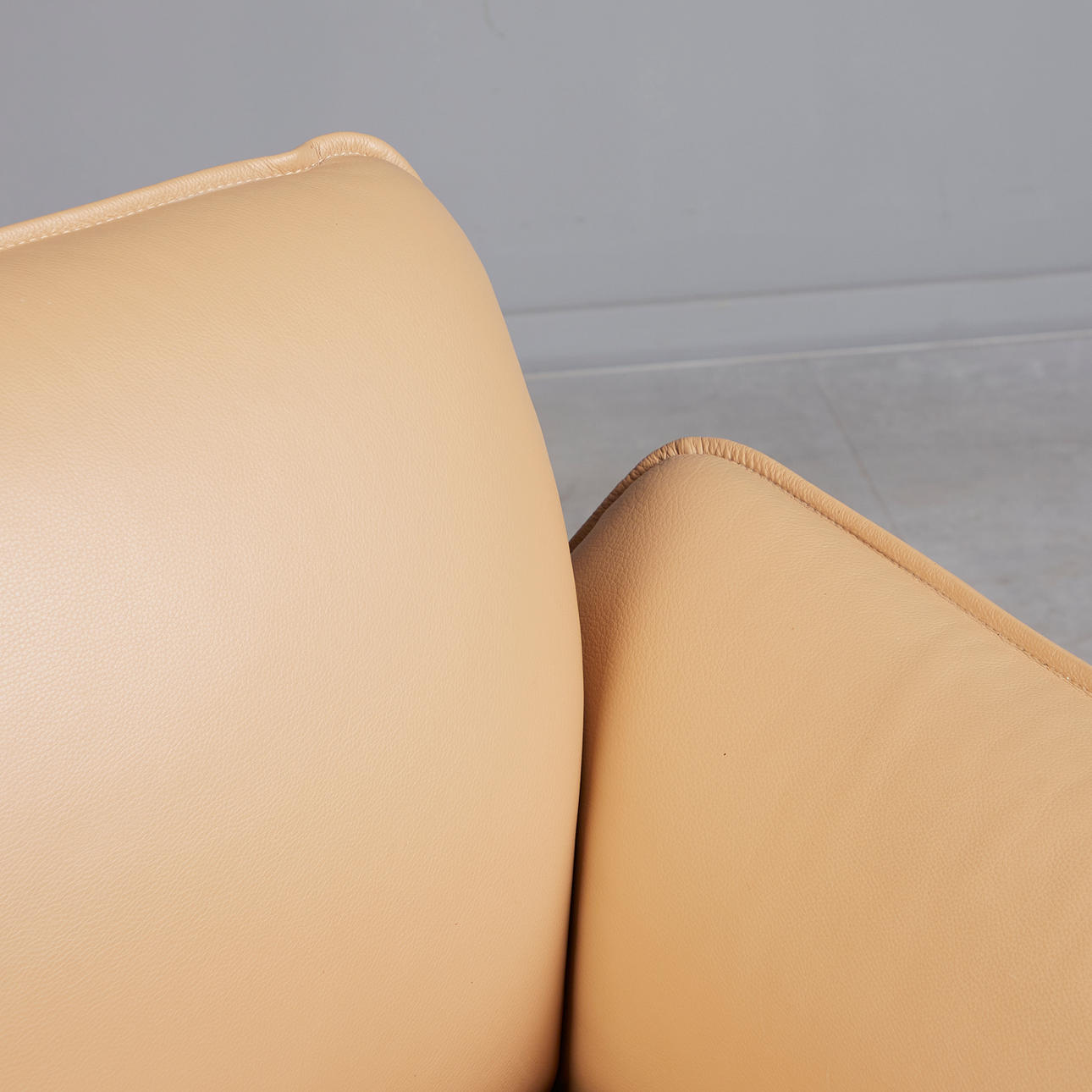 Construcción en teca con reposabrazos tapizados y cojines de asiento y respaldo con tapicería de cuero marrón camel, 77 cm de altura, altura del asiento: 41 cm, 180 cm de ancho, 78 cm de profundidad.
