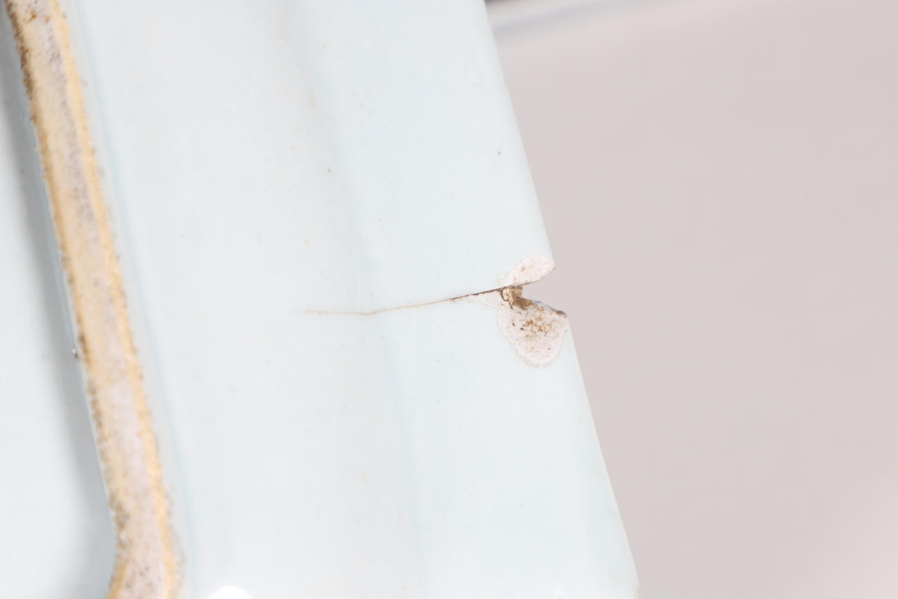 Astilla grande en la llanta con una grieta muy fina que sale de ella (5 cm de largo), otra astilla grande en la llanta y una astilla más pequeña en la parte inferior de la llanta.