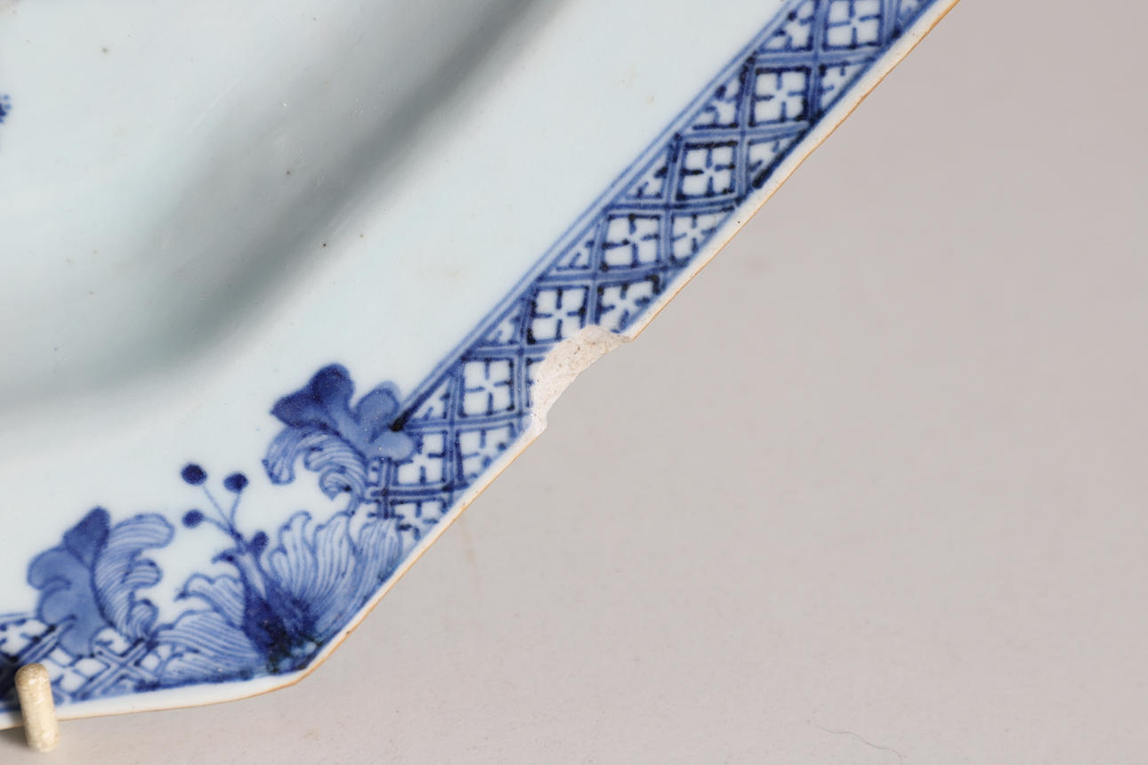 Un plato chino de exportación azul y blanco de los siglos XVIII o XIX, de forma octogonal y pintado con un pájaro posado en un árbol en flor, con más decoración pintada en el borde, incluidas hojas. Algunos daños, 37,5 cm x 37,5 cm.