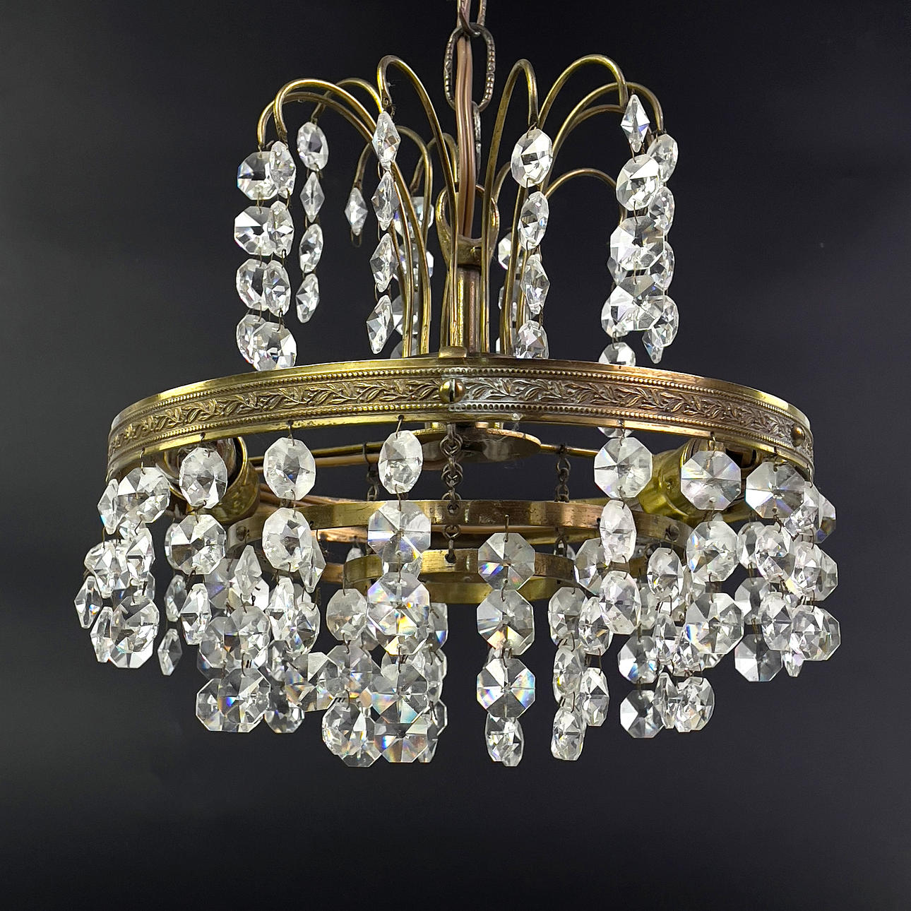 Candelabro/lámpara de techo con prismas. Marco de latón con decoración en relieve. Dos puntos de luz. Estilo imperio, siglo XX.