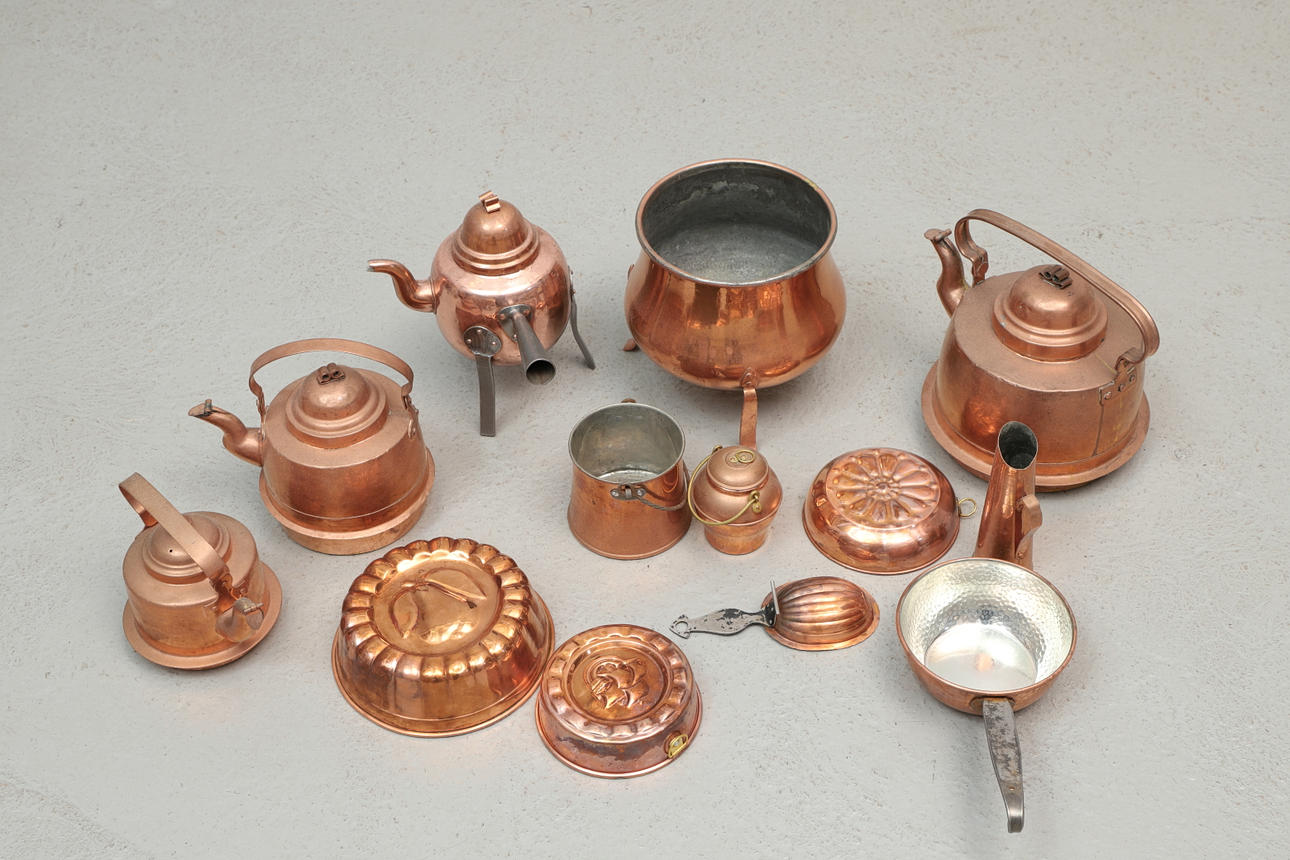 Entre otras cosas. Cafeteras, altura de unos 15-25 cm. Moldes, ancho aprox. 8,5-19 cm. Caldero, altura aprox. 20 cm.