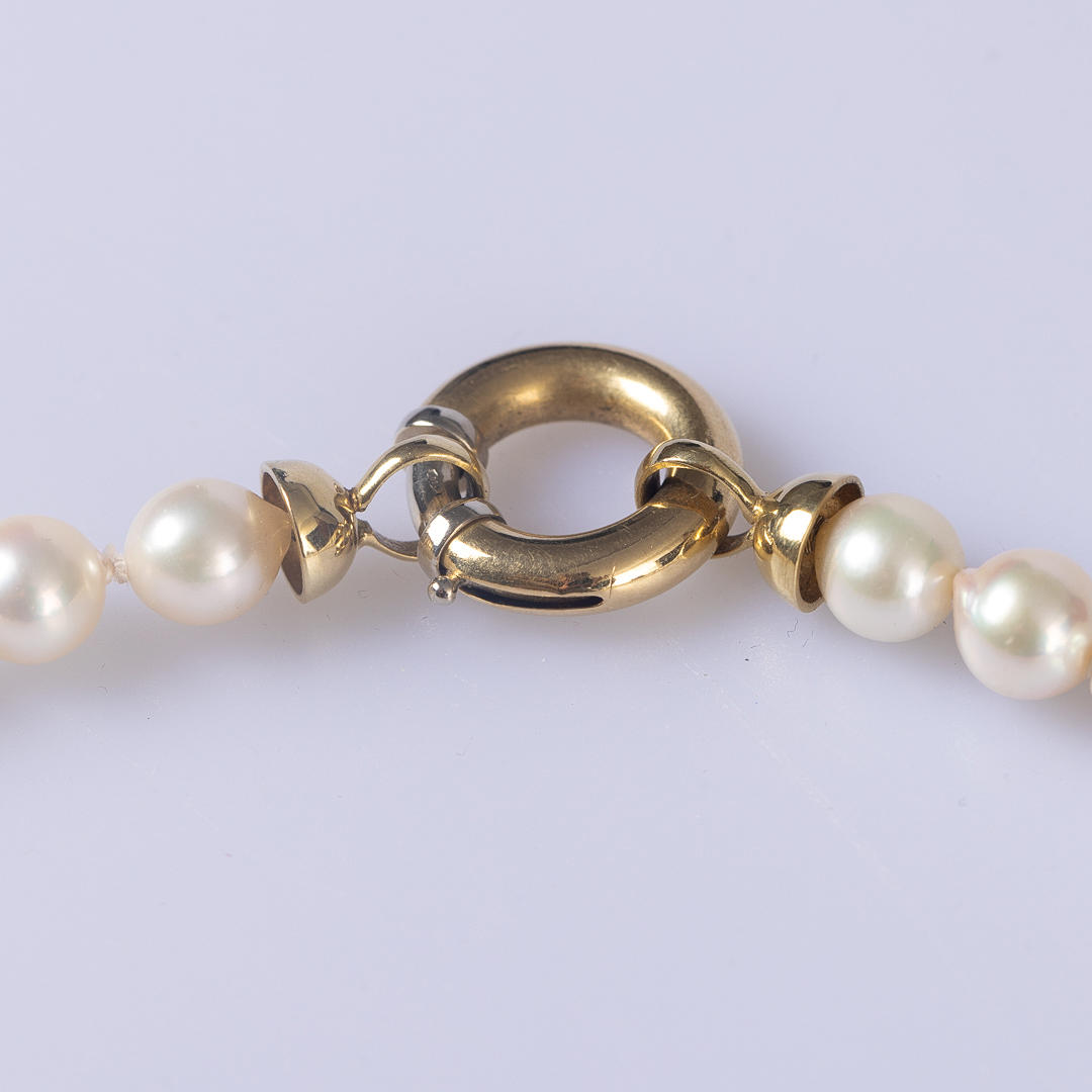 Collar de perlas, 53 perlas de Akoya de 7 a 7,5 mm, anudadas, cierre G585, peso total aproximado 33,8 g, longitud aproximada 48 cm.